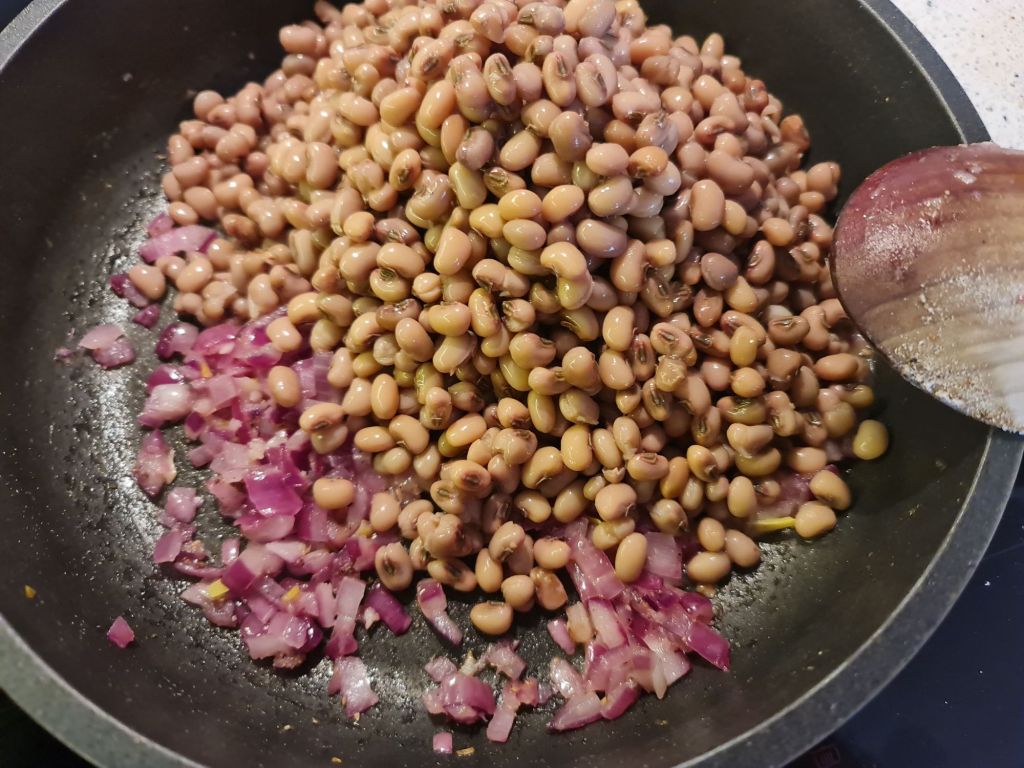 Спазих и собствената си традиция и направих някои промени. Замених кромида с червен лук, добавих чесън и замених пресните червени чушки с печени, от буркан и увеличих количеството им.
