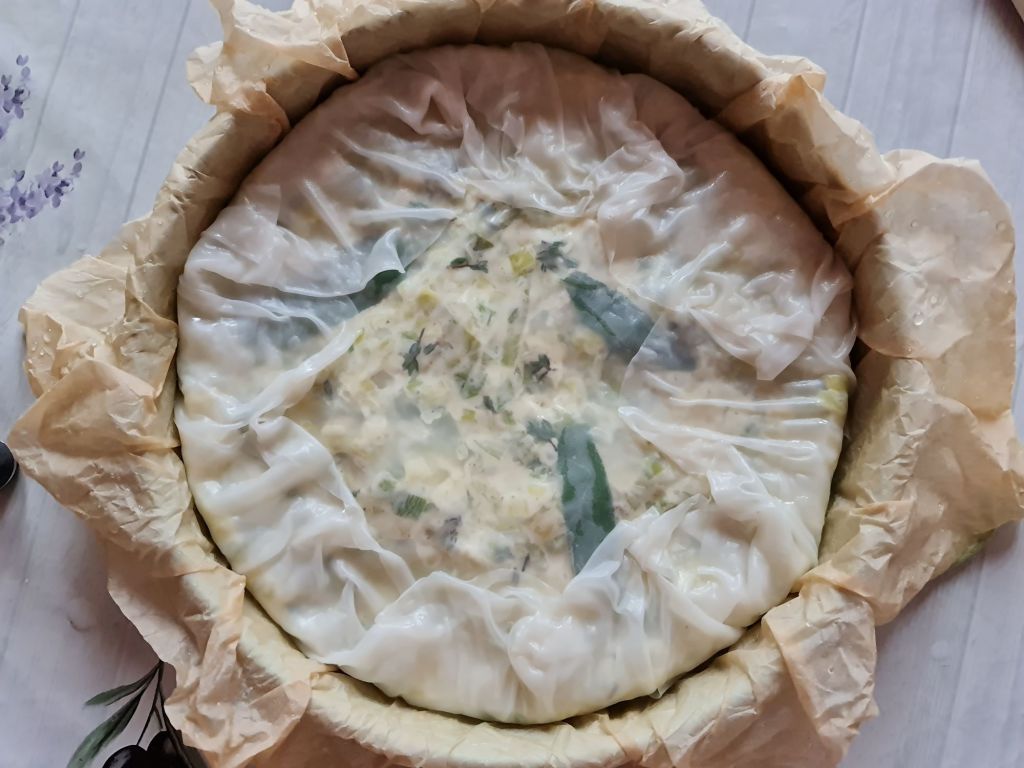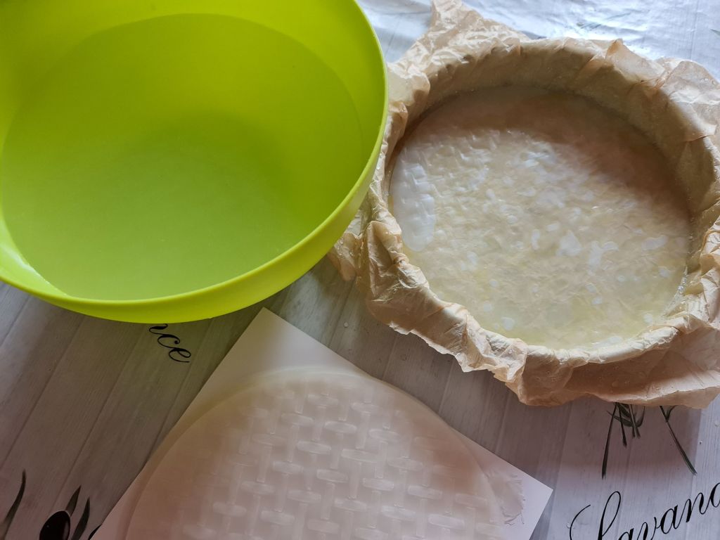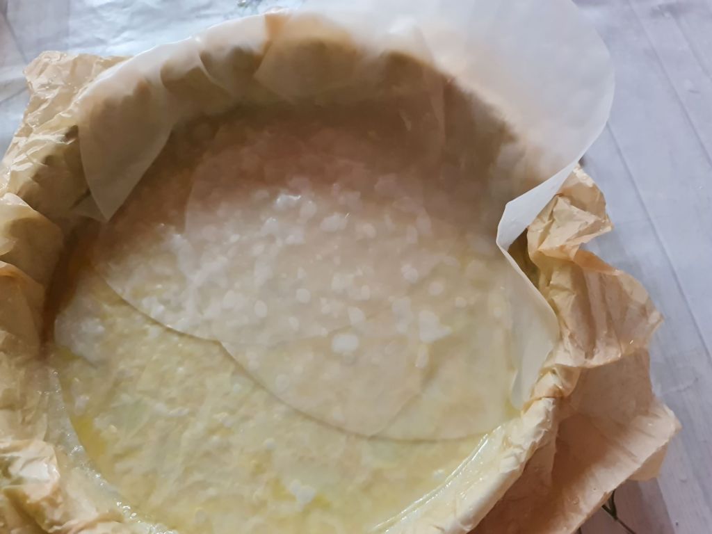 Загрейте фурната до 180 градуса и пригответе тава с диаметър 22 – 23 см. Покрийте с хартия за печене (аз я намокрям, за да заеме по-лесно формата) и намажете със зехтин. Пригответе голям съд с вода, с диаметър по-голям от 22 см. Извадете 1 кора от пакета и потопете за 3 – 4 секунди във водата. извадете и сложете на дъното на тавата.