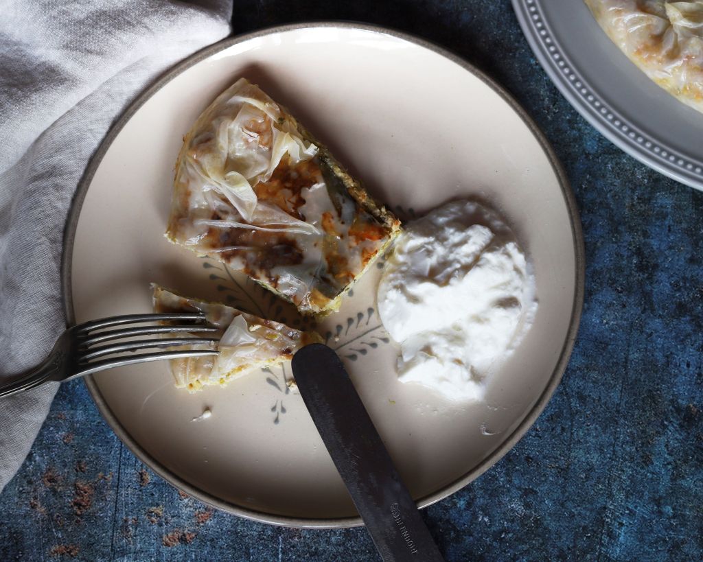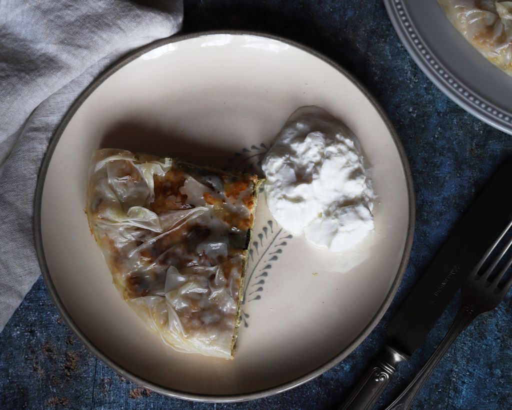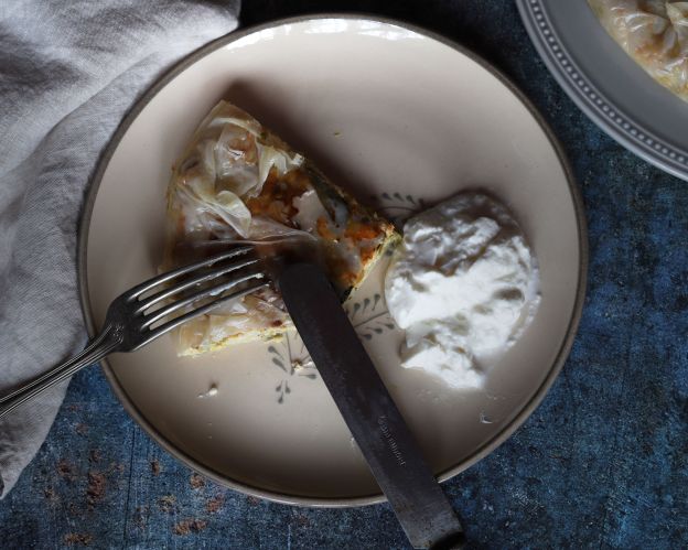 Както ще забележите, тук плънката преобладава и формата напомня пай. Всъщност това беше изходната идея, но трябваше тепърва да приготвям тесто и да го чакам да се охлади. Поради тази причина реших да пробвам нещо различно. Получи се много сполучлива баница, която сервирах с козе кисело мляко за обяд, но би била идеална и за закуска.