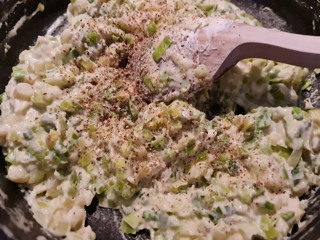 Загрейте 1 с.л. зехтин в дълбок тиган на средна степен на котлона и задушете праза до омекване – около 7 – 8 минути. Добавете изварата и разбъркайте добре. Добавете яйцето (може да го разбиете предварително, но може и да разбъркате след добавяне). Разбъркайте и гответе още около минута. Свалете от котлона и подправете с черен пипер.