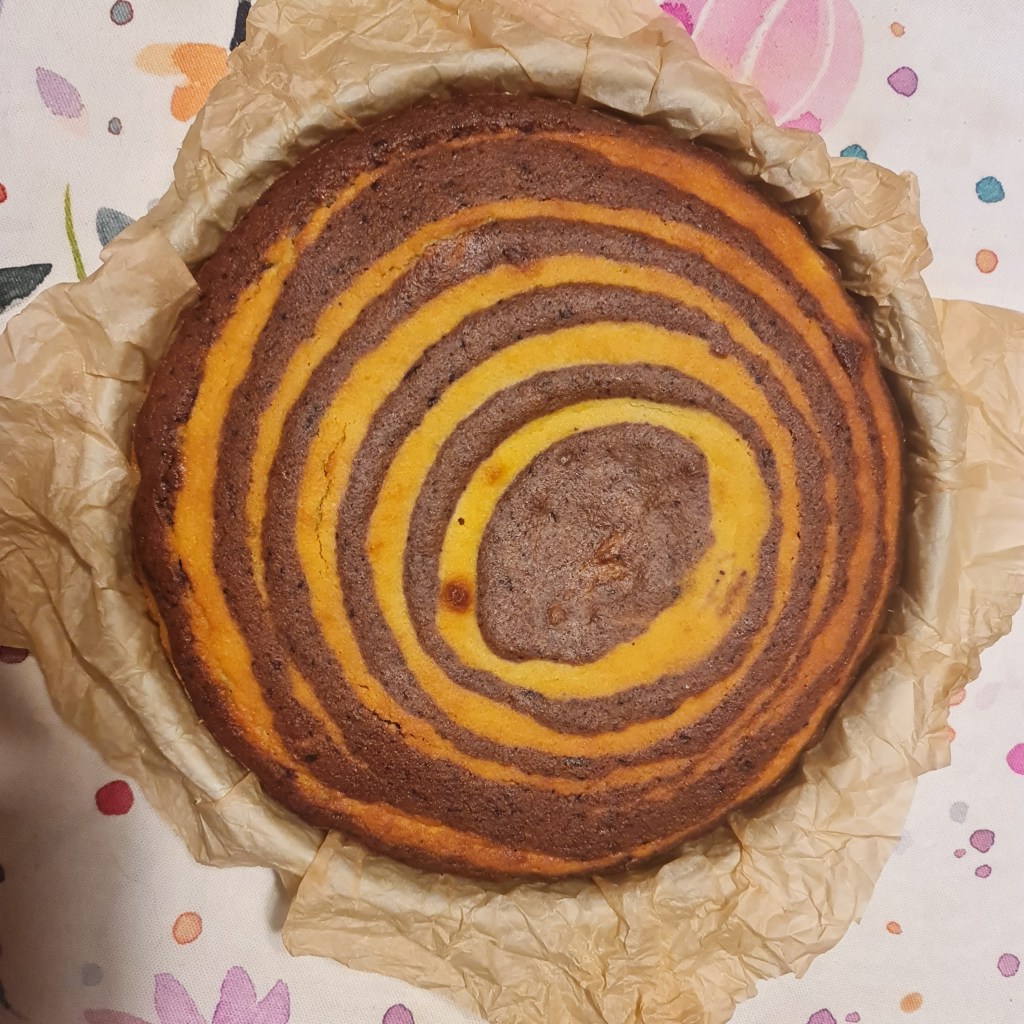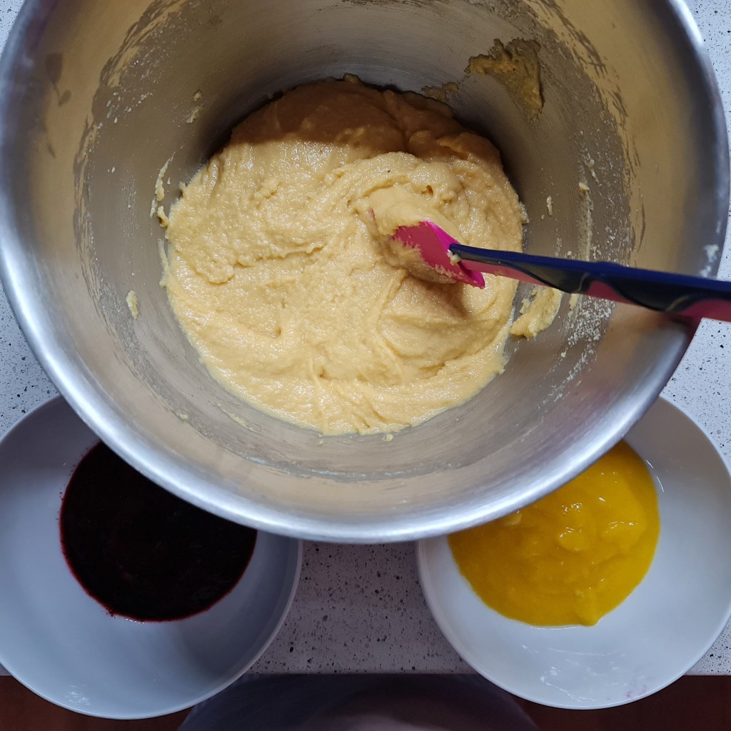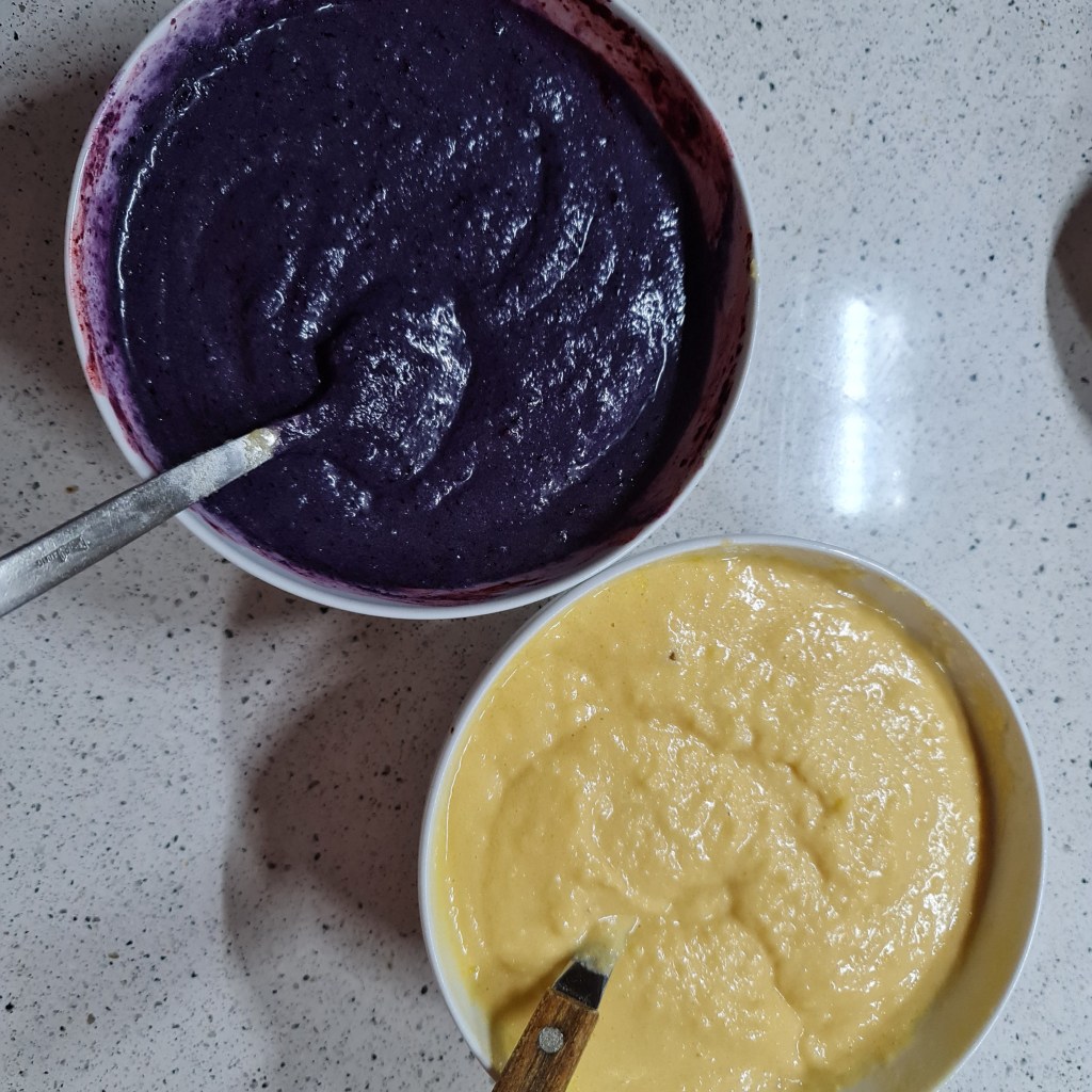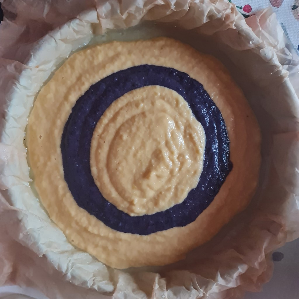Загрейте фурната до 180 градуса и пригответе тава с диаметър 23 см, покрита с хартия за печене и намазана с мазнина. Сипете 4 с.л. с връх от жълтото тесто в средата на формата. Върху него сипете 3 с.л. с връх от лилавото тесто.