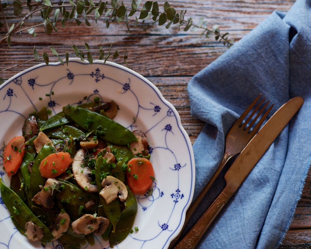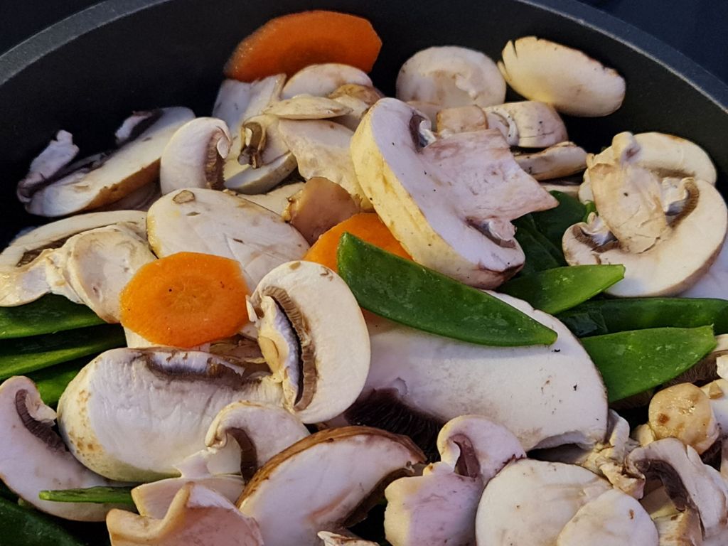 Загрейте маслото в дълбок тиган на средна степен на котлона. Добавете морковите и гответе около 2 минути. Добавете граха и гъбите, разбъркайте и гответе около 6 – 8 минути.