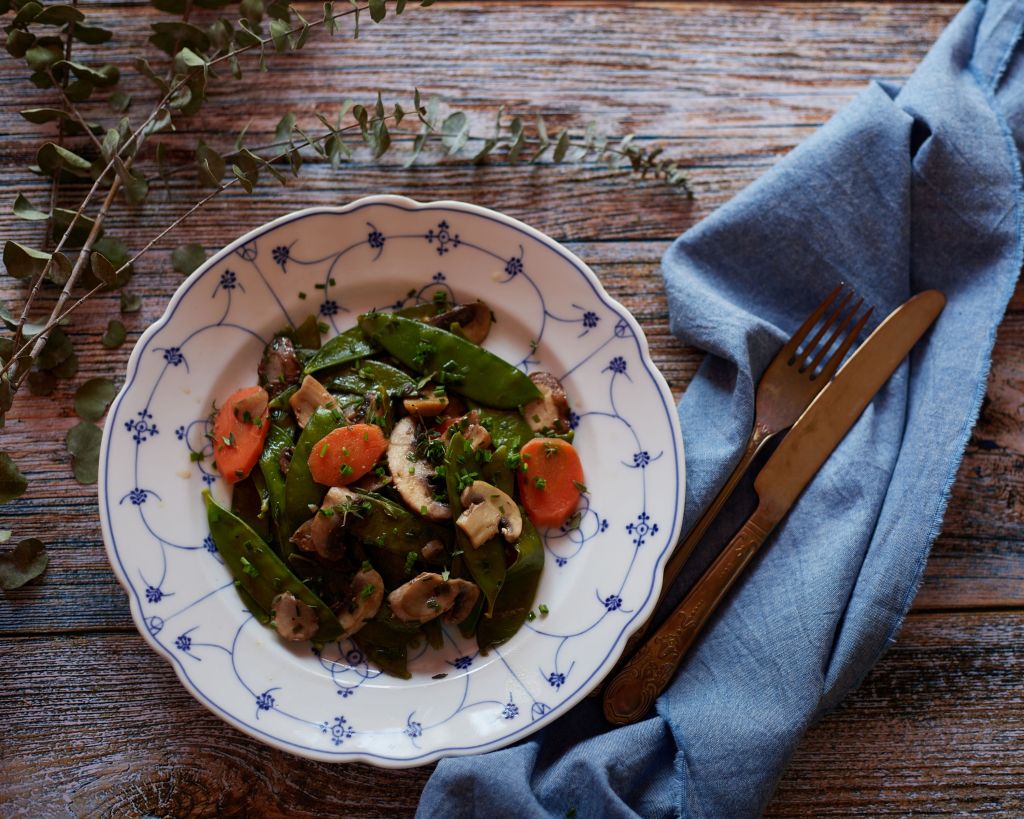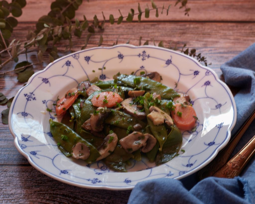Реших да сготвя сладкия грах с гъби и в последния момент добавих морковите. Направих ги на тиган, с масло, защото с него всичко е по-вкусно и завърших с прясна мащерка. За веган версия, ползвайте растителна мазнина.