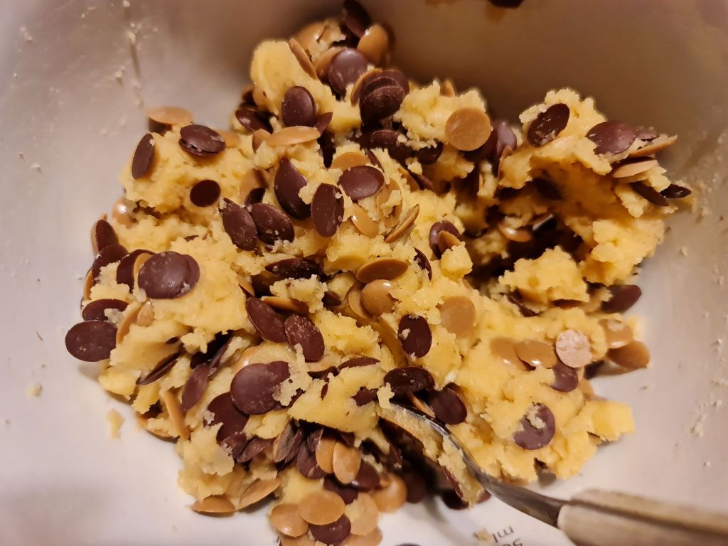 В купа разбийте добре еритритола с яйцето, маслото и етеричното масло. Добавете предварително смесените брашно, сода и сол (ако ползвате стрит чай, добавете го при брашното). Разбийте на ниска скорост и оберете внимателно стените на съда. Последно добавете шоколадовите капки и разбъркайте на ръка. Тестото е гъсто и ще изглежда както на снимката.
