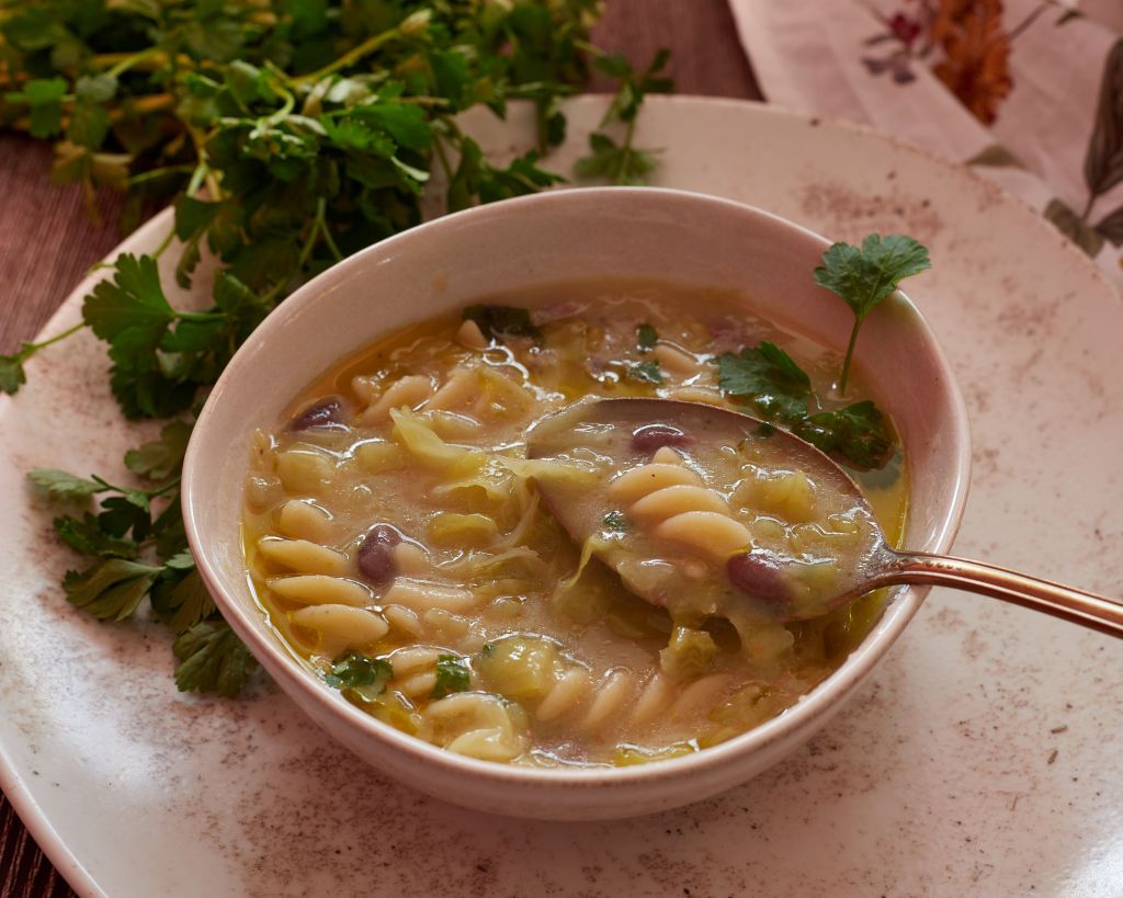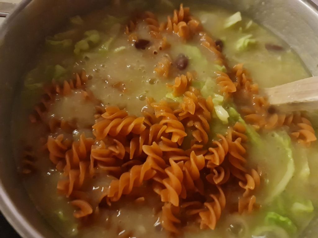 С ръчен пасатор, пасирайте сместа до гладка крем супа. Подправете със сол и черен пипер. Добавете зелето и боба и варете 10 минути. Добавете пастата според времето за варене, така че да съвпадне с 10те минути на зелето. В моя случай пастата трябваше да се вари 8 минути, затова я добавих две минути след боба и зелето.