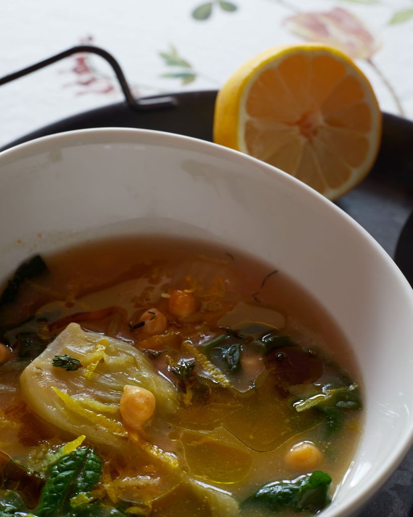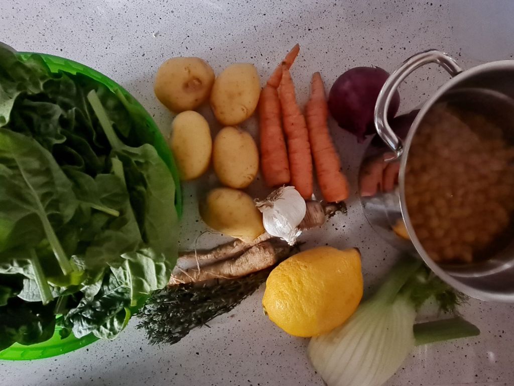 Освен фенел имах нахут, спанак, моркови, корени от магданоз и няколко пресни картофа. Комбнацията е леко странна, но реших да й дам шанс. Имам си един любим сайт, на който има интересни предложения за съчетаване на вкусове. От там дойдоха лимонът и прясната мащерка, които са много подходяща компания както за фенел, така и за спанак.