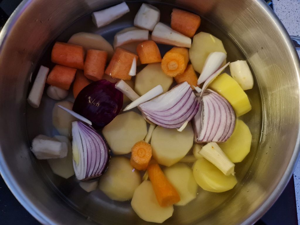През това време нарежете на едро лука, морковите, чесъна, корените от магданоз и картофите и сварете до омекване на морковите – около 30 минути.