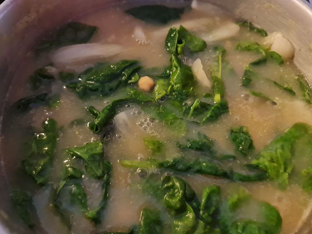 Добавете отцедения нахут и спанака. Разбъркайте и свалете от котлона. Топлата течност ще бъде достатъчна за частично сготвяне на спанака.
