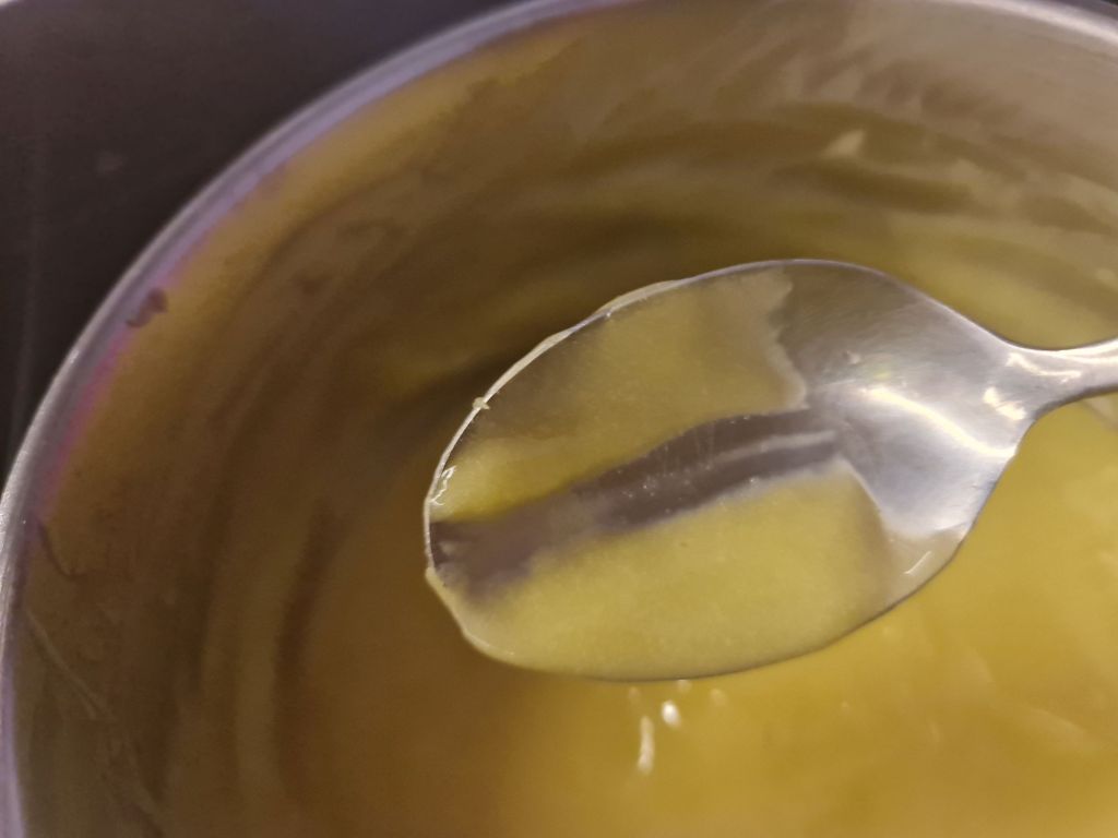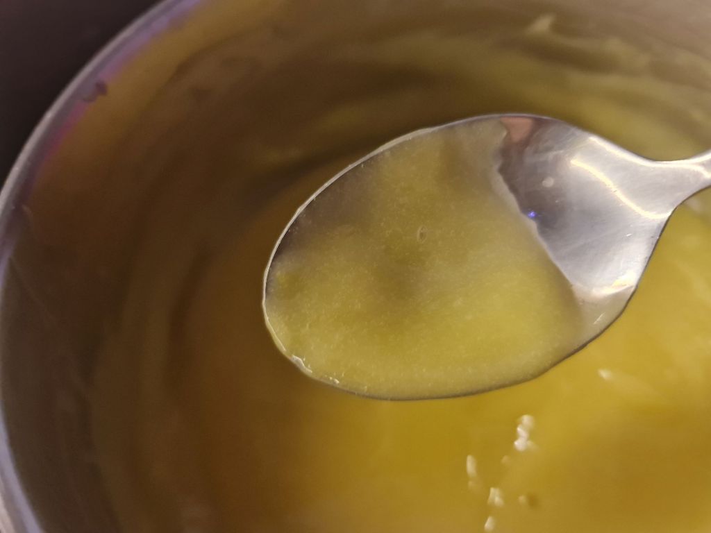 В малка тенджера разбийте жълтъците с лимоновия сок и еритритола. Загрейте на слаб огън с бъркане, докато започне да се сгъстява. Добавете маслото на части, като разбърквате до пълно абсорбиране преди да добавите следващата. Кърдът е готов, когато потопите лъжица в него, наклоните я и когато прекарате пръст през крема, този над „пътечката“ не се слива с този под нея.