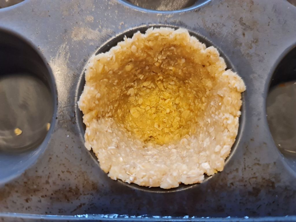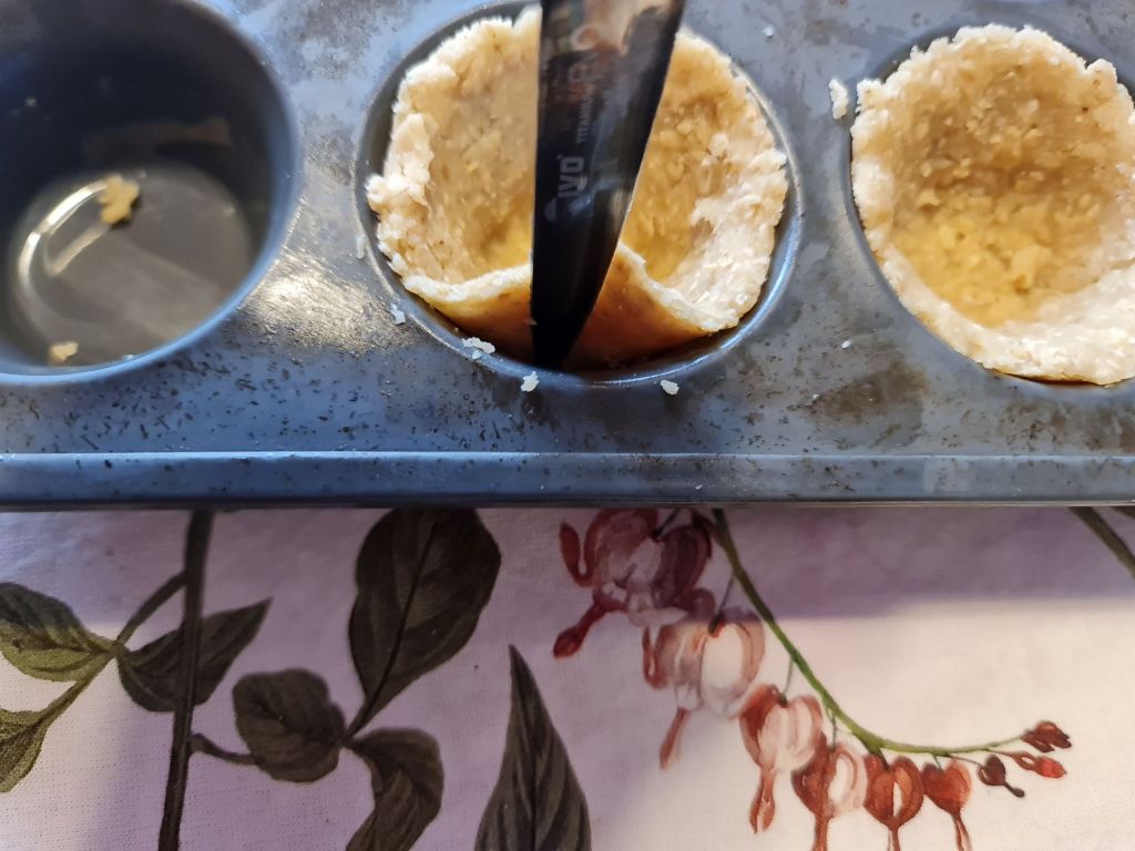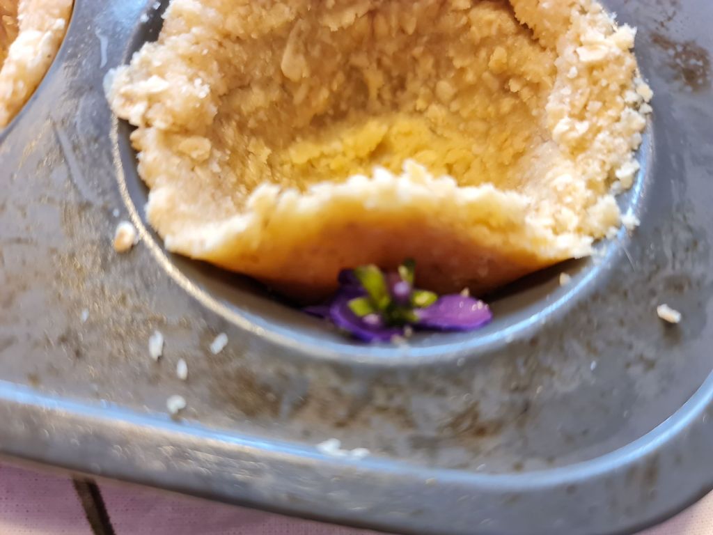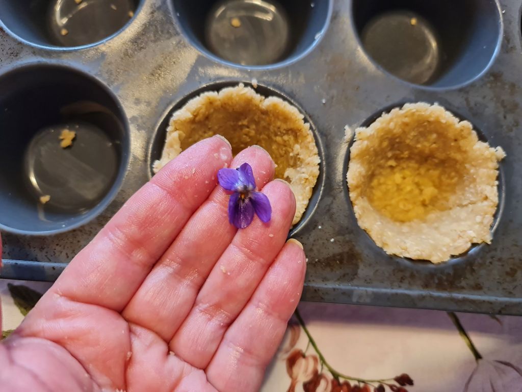 Оформете топчета и от тях с притискане оформете основите на тарталетите. Ако имате виолетки и желание, може да ги добавите към основата, както е показано на снимките.