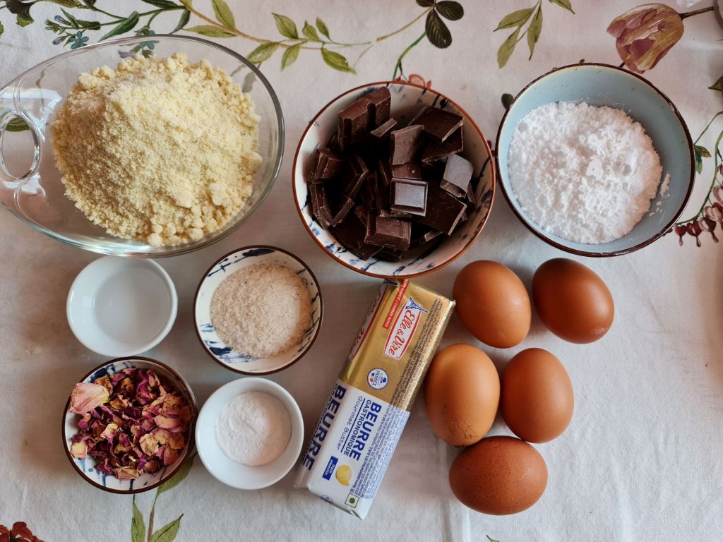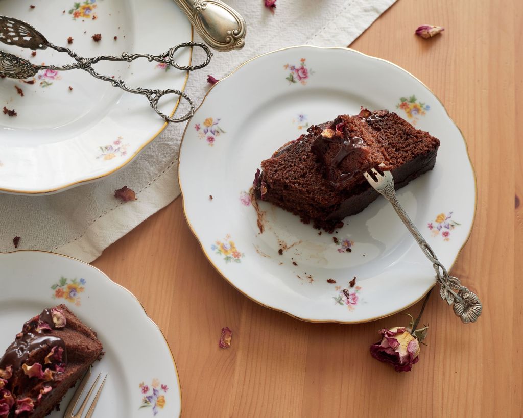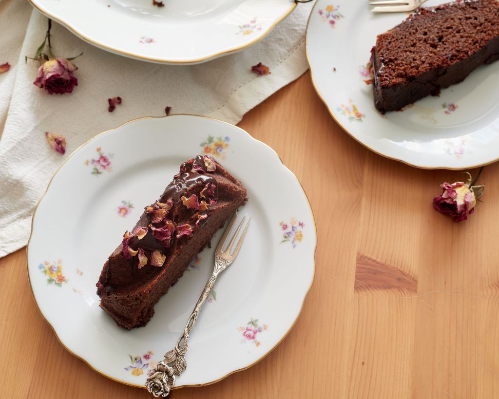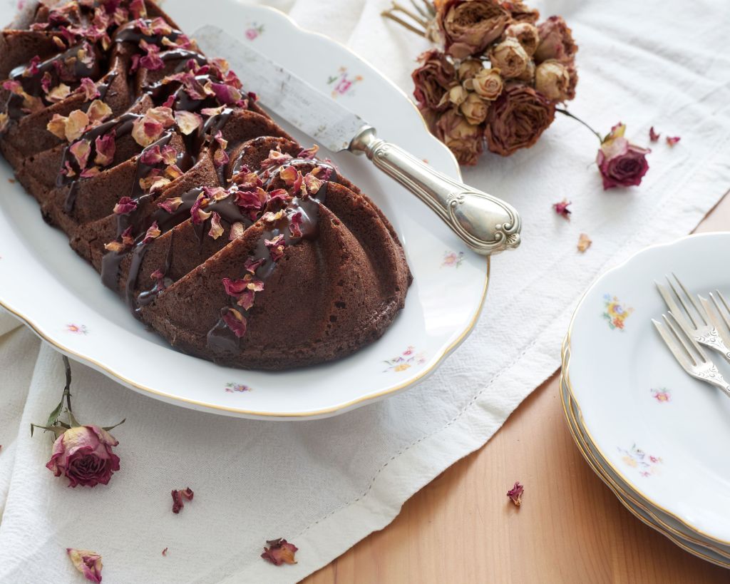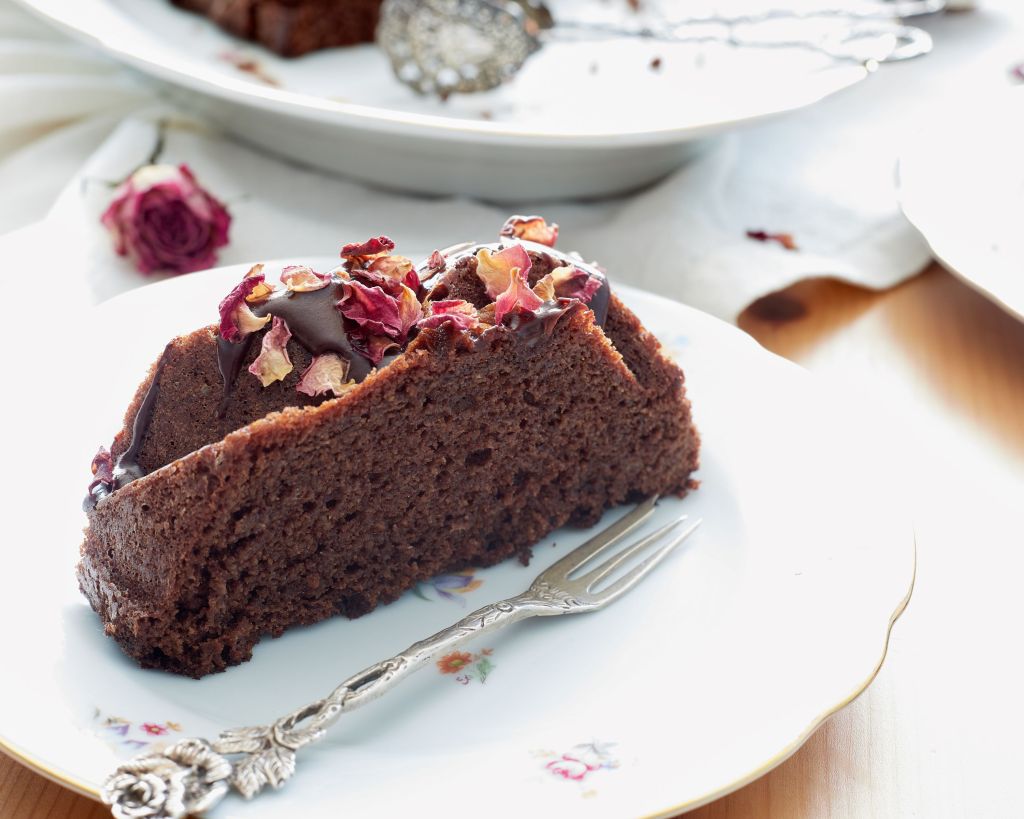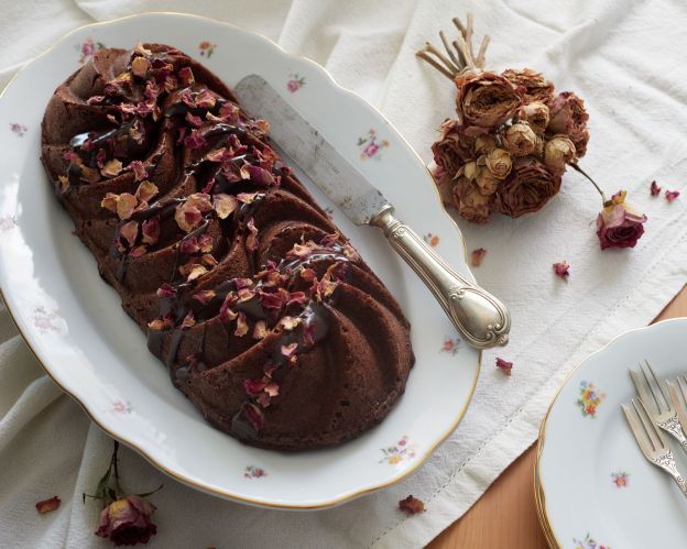 Печете 40 минути (проверете за готовност с клечка, преди да извадите) и изчакайте да изстине напълно преди да извадите от формата. За декорация разтопете 40 г шоколад на водна баня със сметаната. Полейте кекса, без да го покривате напълно (количеството не е достатъчно за това) и поръсете със сушени розови листенца.