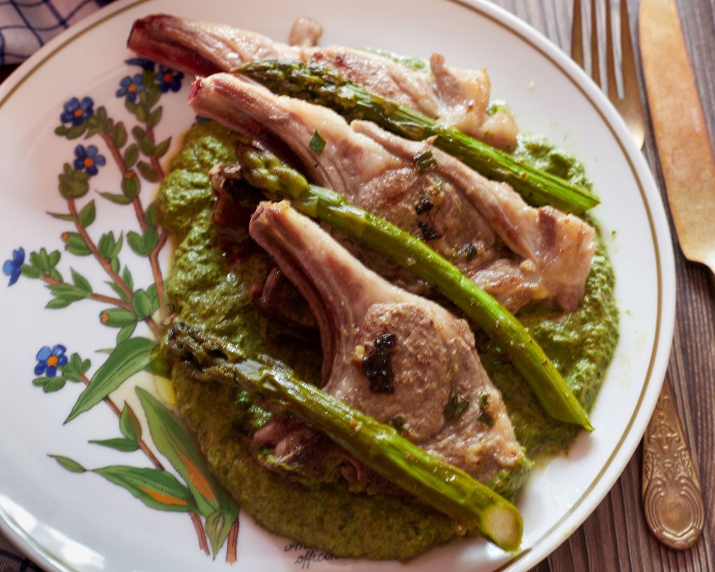 Гответе котлетите по 3 до 5 минути от страна, в зависимост от степента на готовност, която искате. Сервирайте котлетите върху канапе от пюрето и гарнирайте с аспержите.