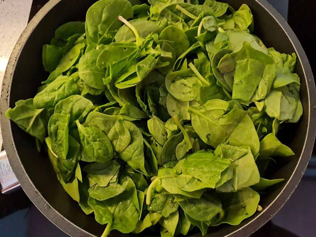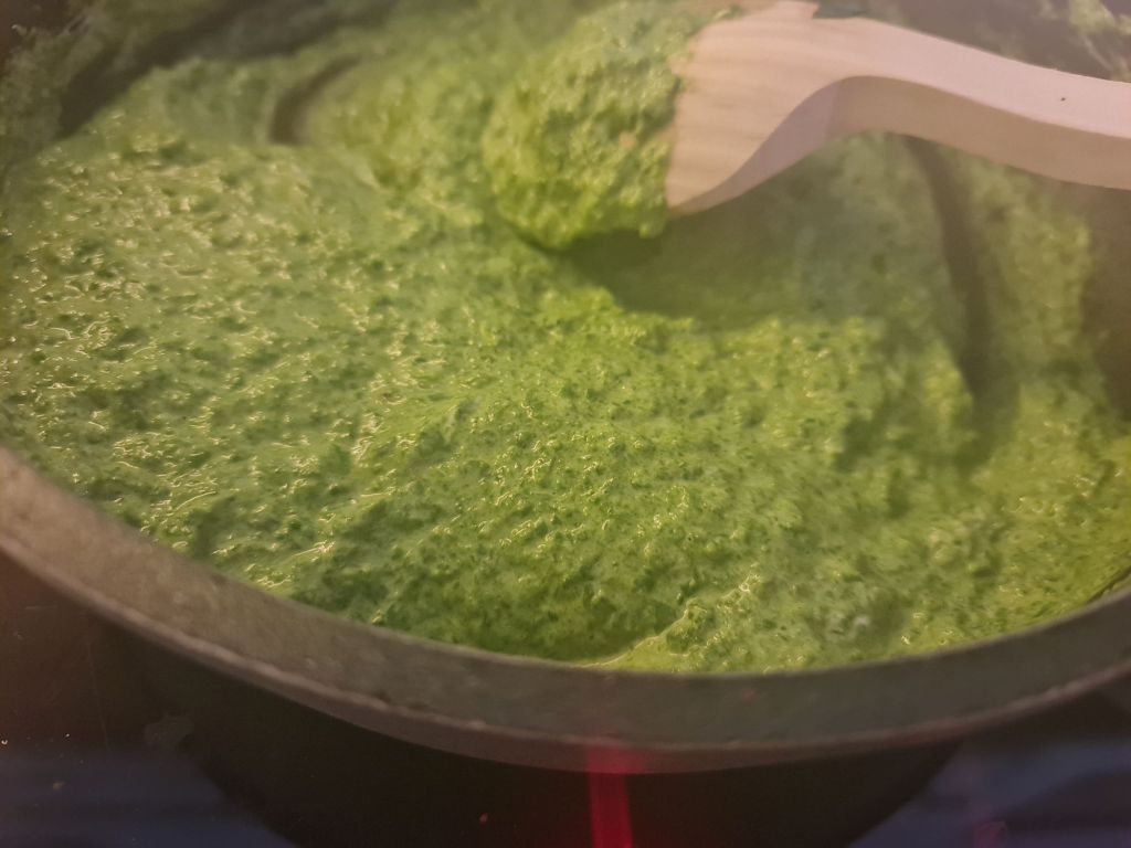 Ако ще печете чесъна, започнете от него (може да го сложите в отделен съд заедно с аспержите, за да спестите време). Когато е готов, изчакайте да се охлади и обелете. Измийте спанака много внимателно и го подсушете. Загрейте дълбок тиган на средна степен на котлона без мазнина и гответе спанака докато омекне – около 4 минути. След това добавете печения чесън и пасирайте. Аз го правя директно в тигана с ръчен пасатор с метален накрайник. Ако ще пасирате в блендер с пластмасова чаша, изчакайте да изстине, преди да прехвърлите там. След това върнете обратно в тигана, добавете изварата и подправете със сол, черен пипер и индийско орехче и разбъркайте до хомогенизиране. Гответе още около 4 минути и оставете похлупено до сервиране.