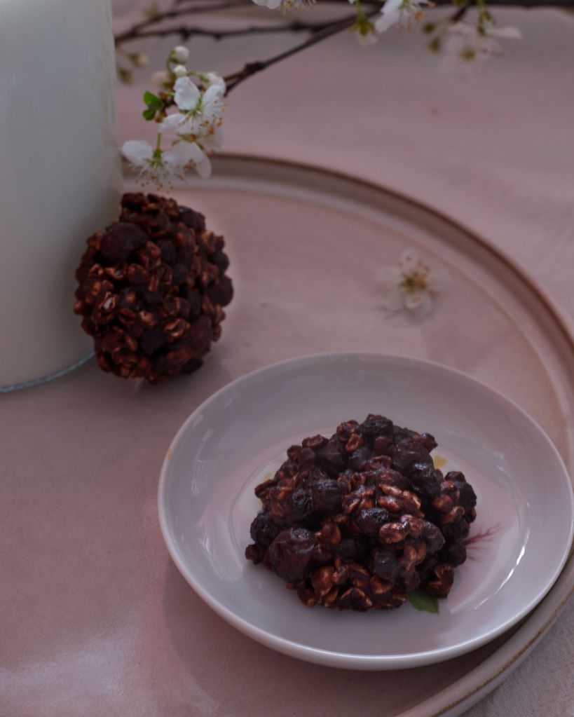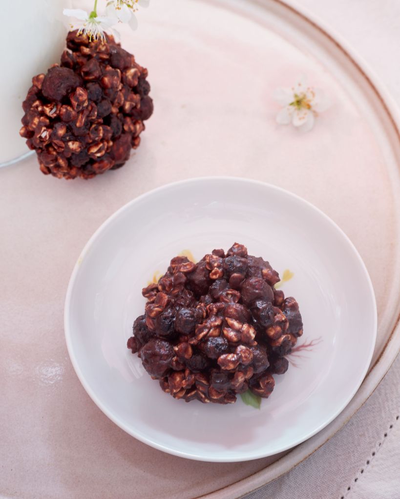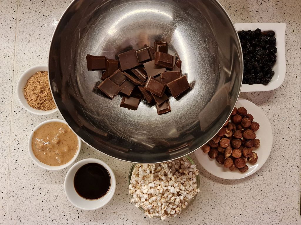 На водна баня разтопете шоколада. Добавете тахана, петмеза и брашното и разбъркайте добре. Добавете лешниците, елдата и аронията и разбъркайте докато се покрият с шоколад.