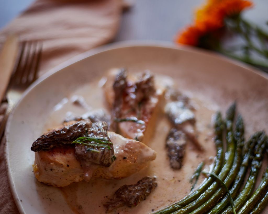 Сервирайте пилешкото филе с гъбения сос и аспержите.