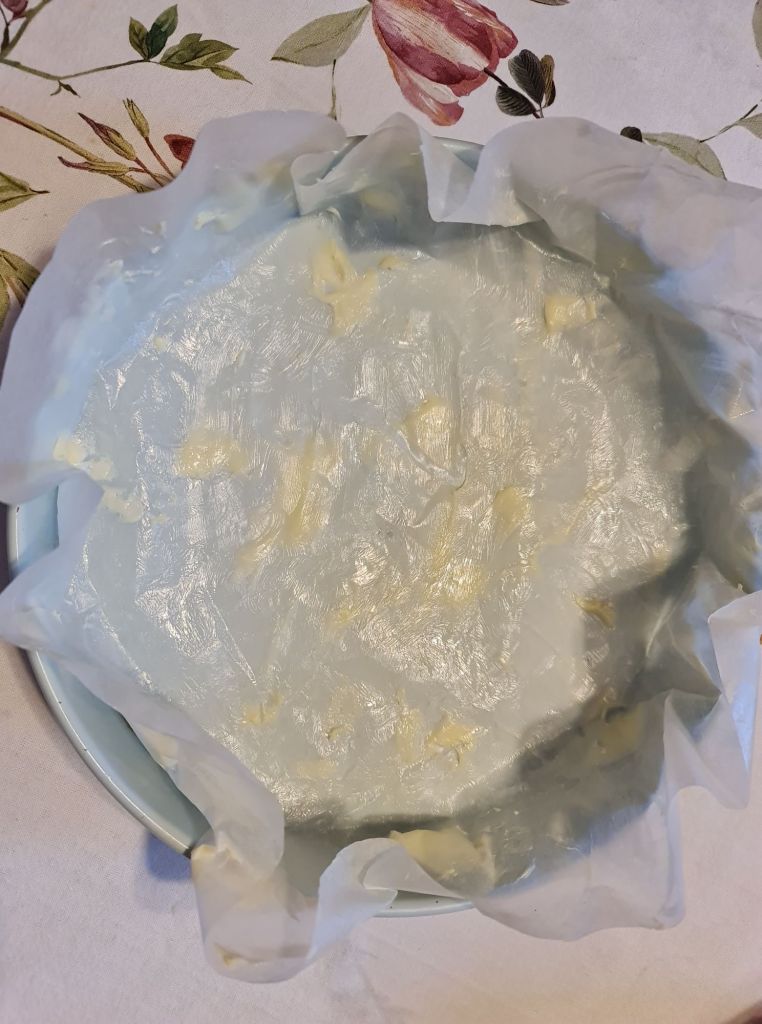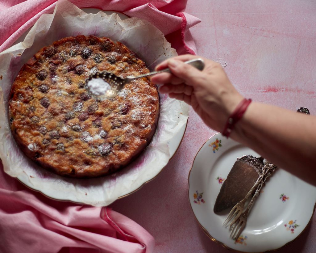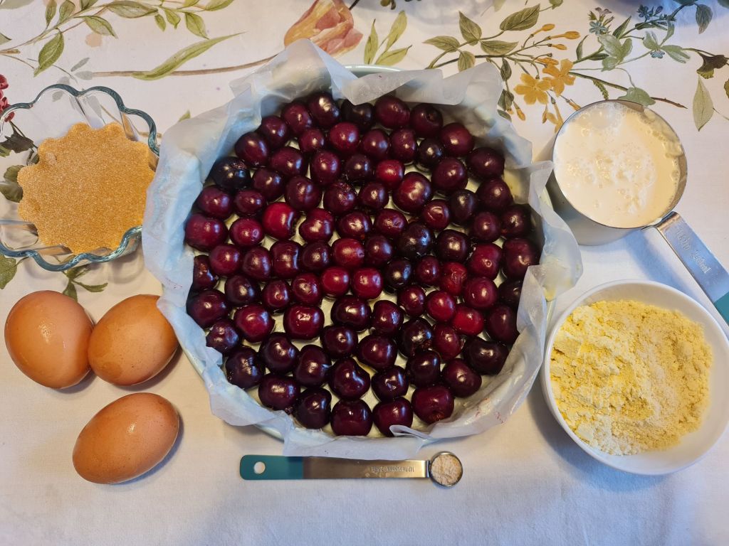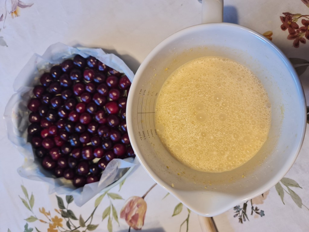 Загрейте фурната до 190 градуса. Пригответе тава с диаметър 21 – 23 см и я намажете добре с масло. В моя случай единствената тава с такъв размер беше с падащо дъно, а това не е подходящо, понеже тестото е с консистенцияна тесто за палачинки. Затова я покрих с хартия за печене, която намазах обилно с масло. Отгоре разпределете черешите.