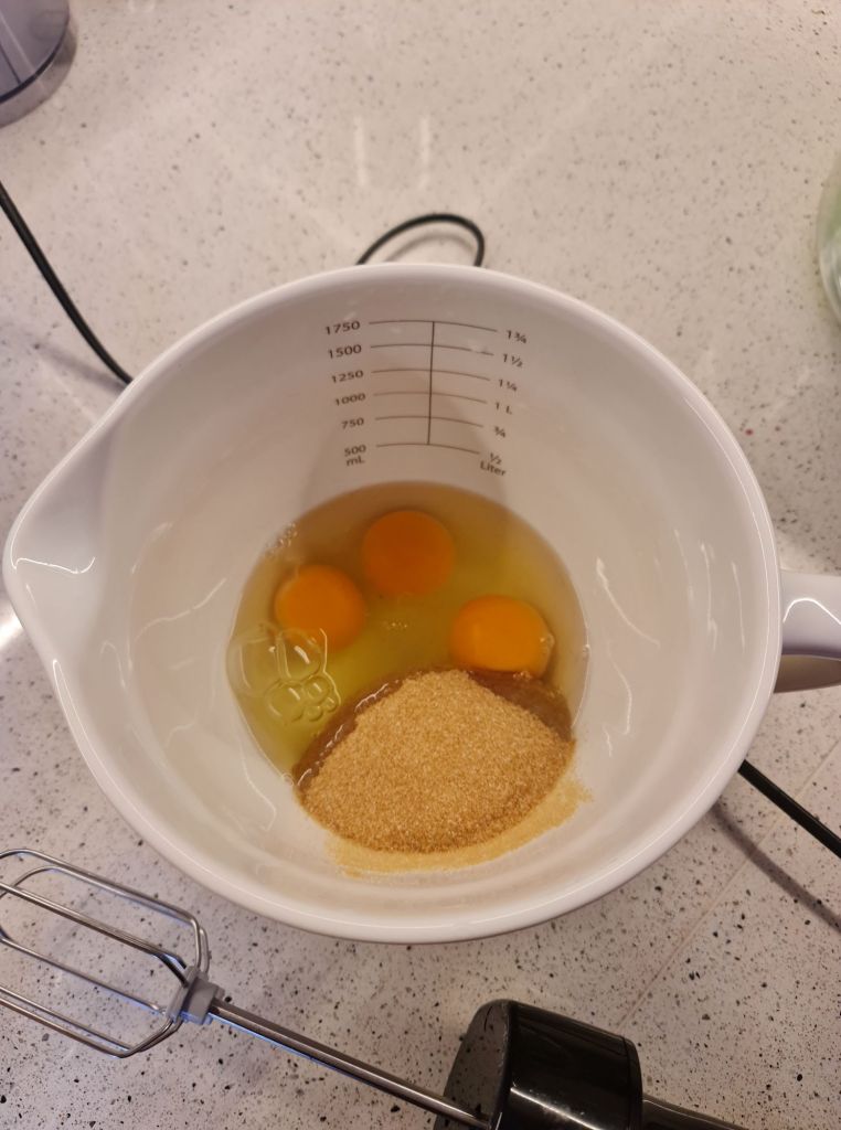 С миксер разбийте яйцата и кето карамела до бледо жълта пухкава смес. Добавете сметаната и разбийте отново. На части добавете брашната, които сте смесили предварително с махлеба.