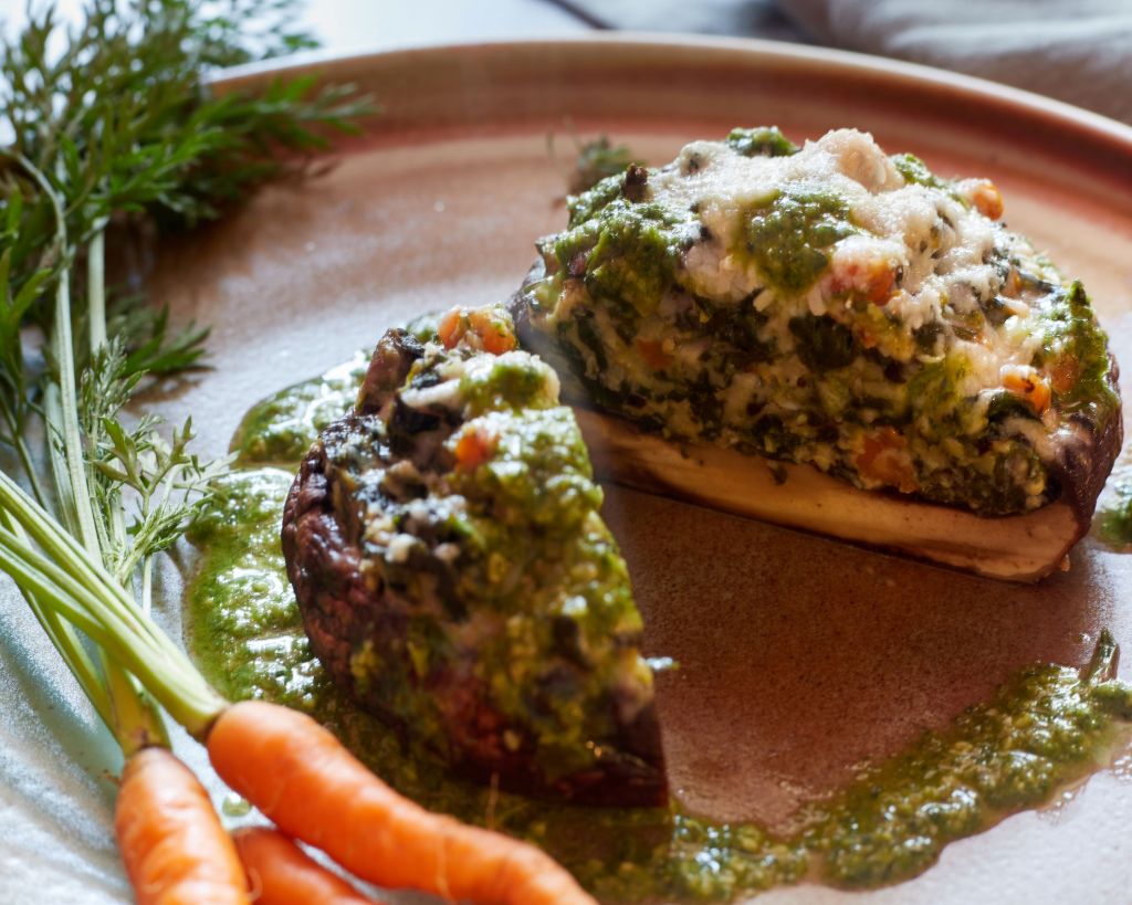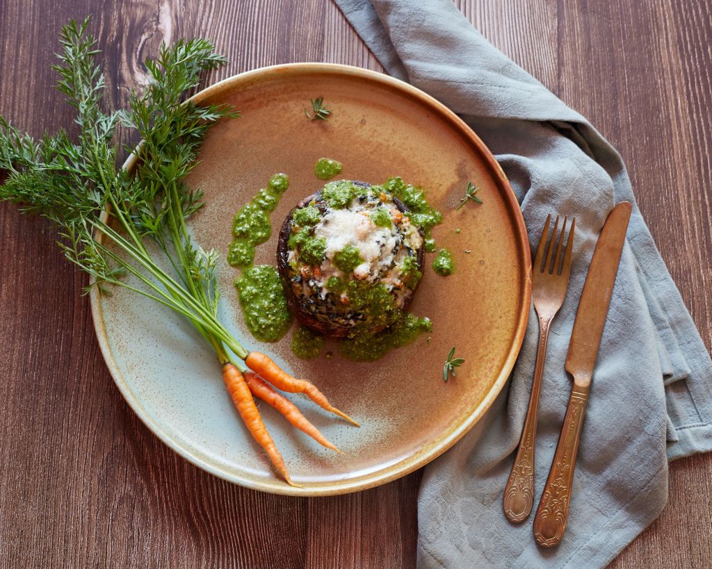 Много отдавна не бях правила пълнени гъби и при последното посещение на фермерския пазар две големи и дълбоки портобели ми грабнаха окото. Повечето рецепти, които циркулират, са с бекон или друго месо и кашкавал. Затова исках да пробвам нещо сезонно и не толкова обичайно.