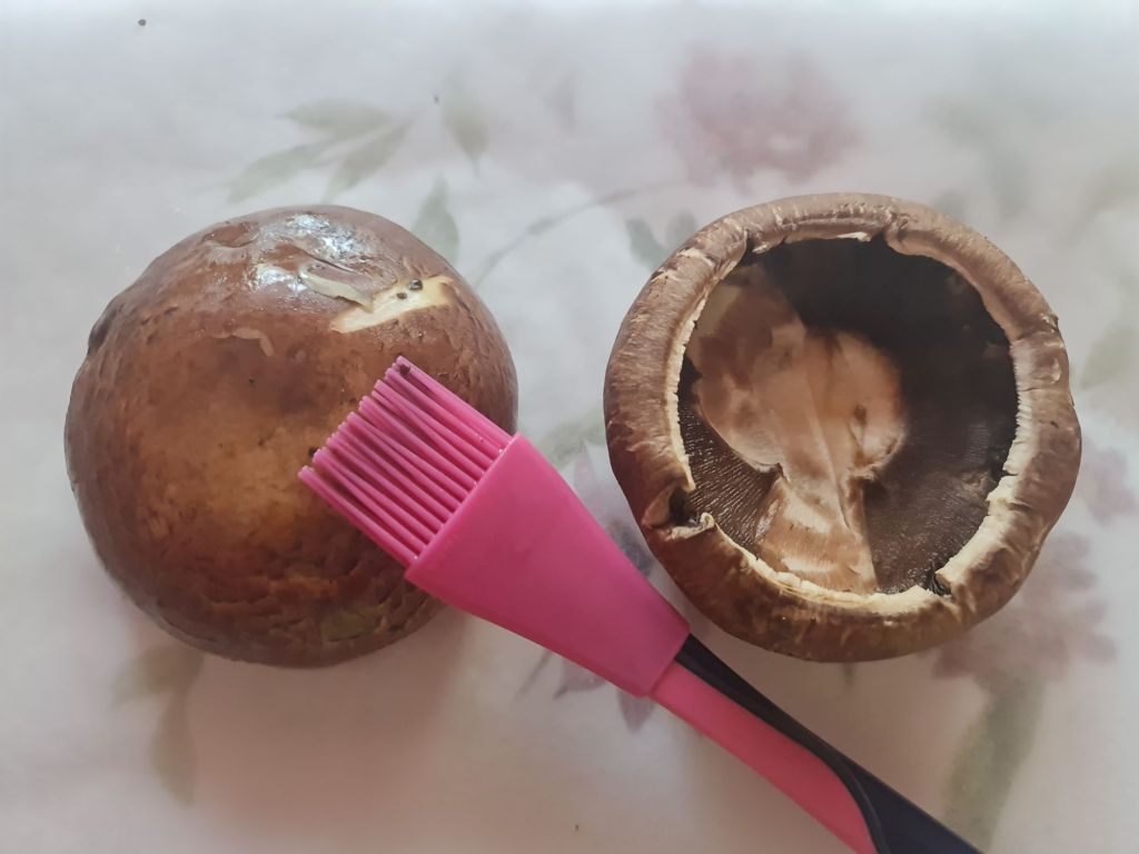 Загрейте фурната до 180 градуса. Измийте и почистете гъбите, като премахнете всички остатъци от пънчета. Намажете със зехтин и сложете във фурната с вдлъбнатината нагоре. Печете 10 минути.