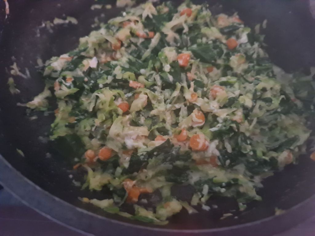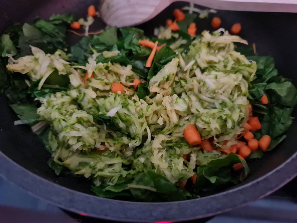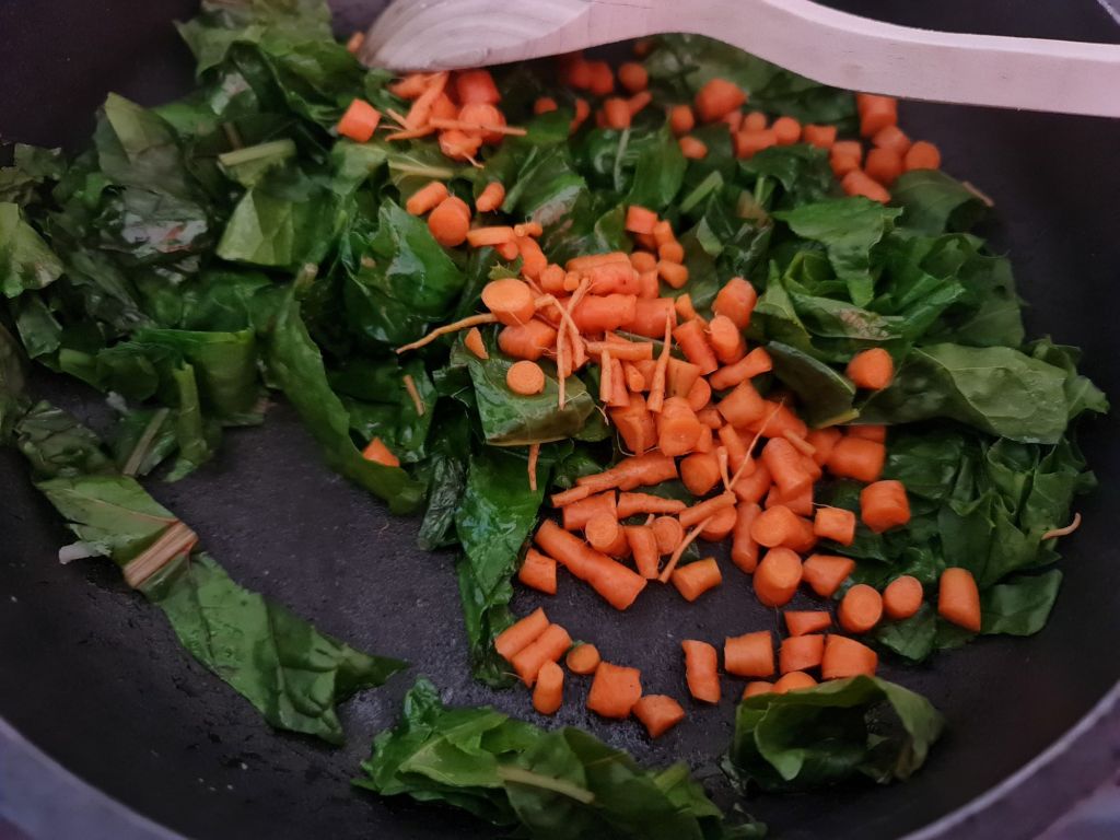 В тиган с дебело дъно на средна степен загрейте зетхина и добавете чесъна. Задушете за една минута и добавете манголда и морковите. Разбъркайте и гответе 2 – 3 минути. Добавете отцедените тиквички и подправете със сол и черен пипер. Гответе 5 – 6 минути и добавете изварата. Разбъркайте и свалете от котлона. Оставете да се охлади.