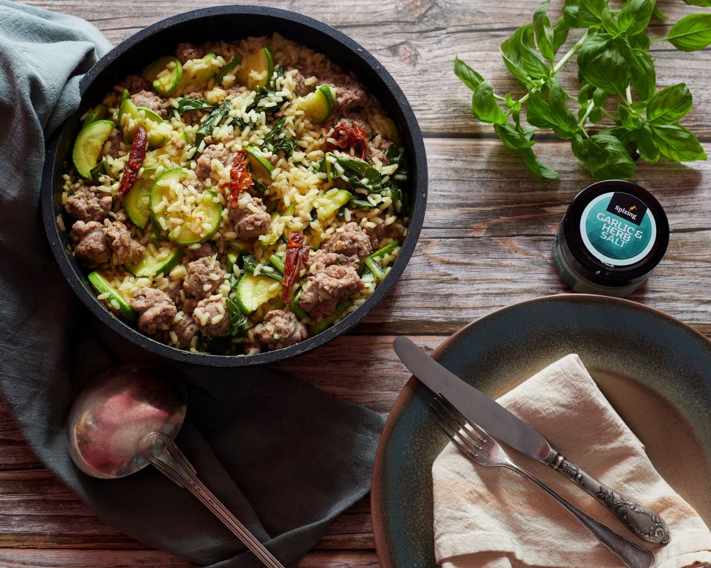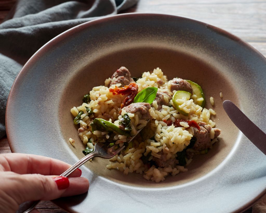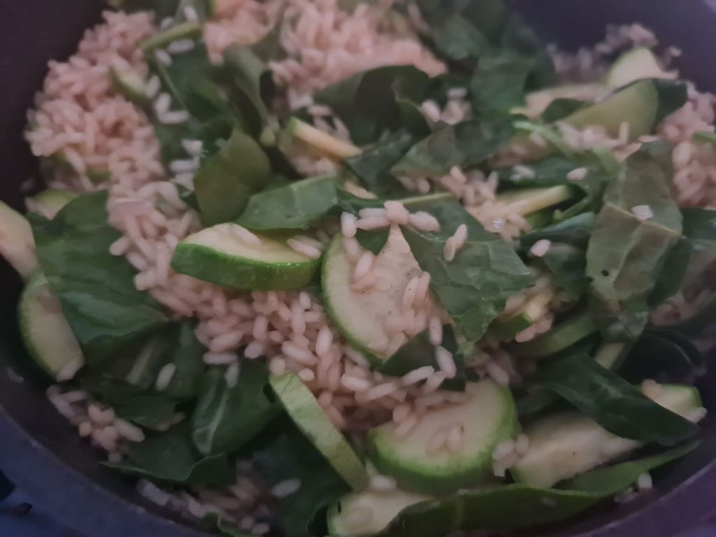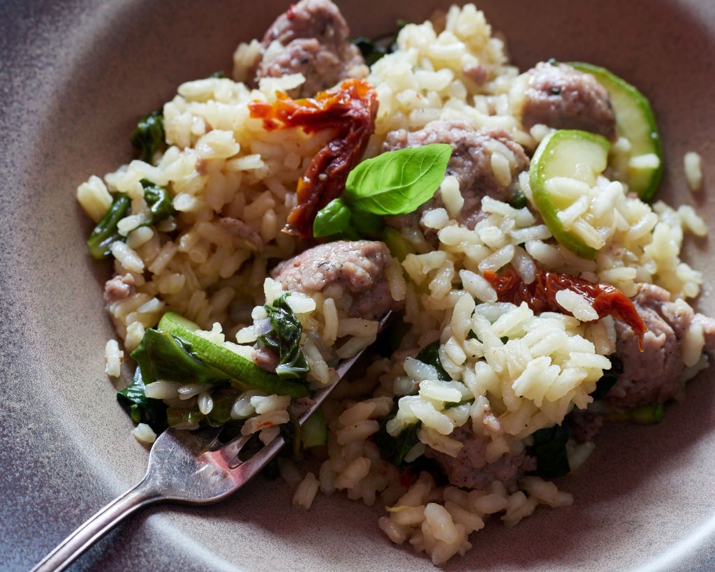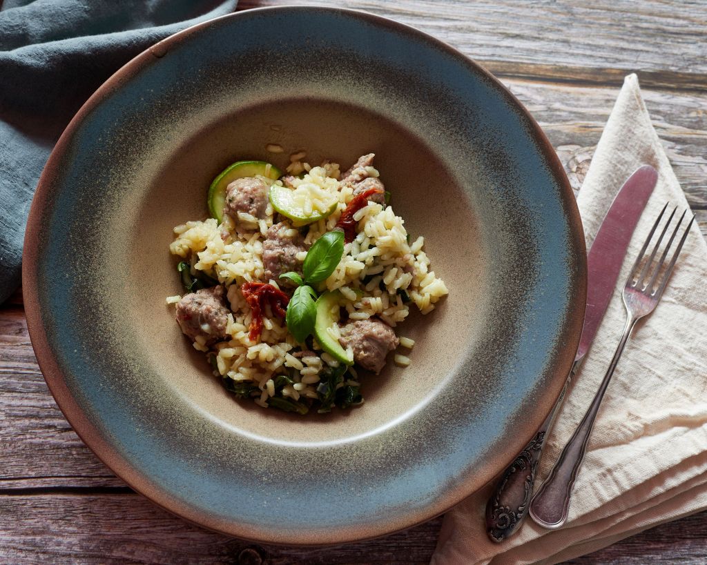 Това не е традиционно ризото, в което оризът е значително повече от останалите продукти. Tук той има по-скоро поддържаща роля, допълнен от тиквички, манголд и сушени домати за неповторим средиземноморски вкус.