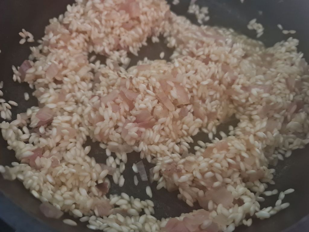 Гответе 3 – 4 минути и добавете ориза. Разбъркайте добре и добавете виното. Гответе 3 – 4 минути, посолете и добавете 1 чаша бульон. Гответе с разбъркване докато се поеме и добавете следващата чаша.