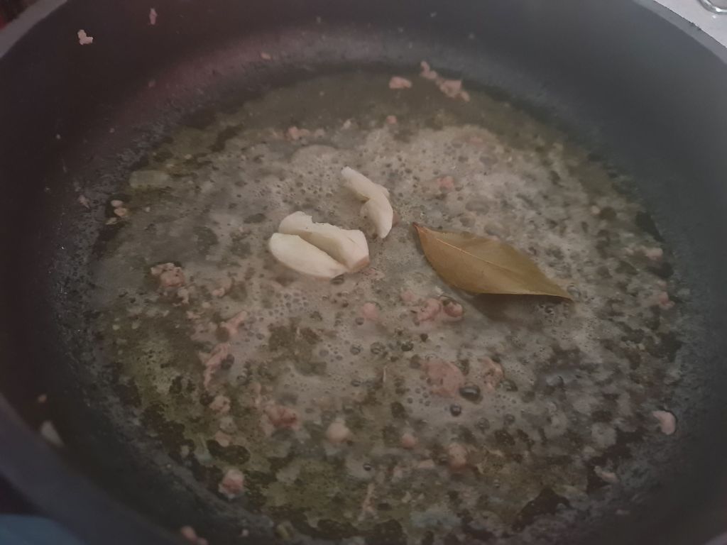 Загрейте зехтина в дълбок тиган на средна степен и добавете наденицата. Гответе, докато е почти готова и отстранете с решетеста лъжица. Добавете чесъна и дафиновия лист и гответе минута – две. Извадете ги и добавете лука.