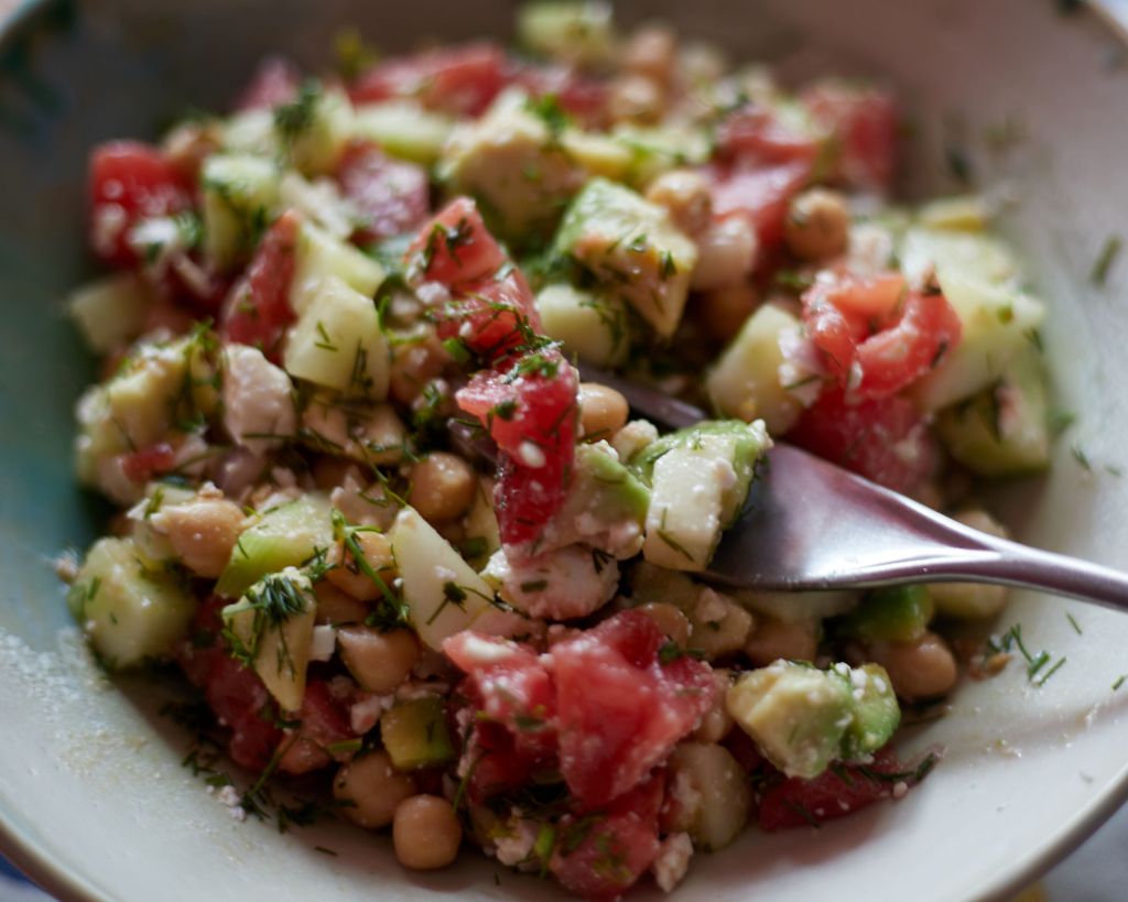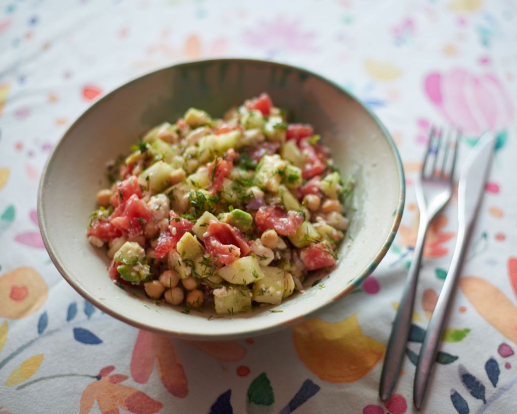За да не прибягваме до поръчка, реших да направя някаква салата, която да е достатъчно засищаща, за да бъде основно. След преглед на хладилника и бърза прибежка до близкия магазин се получи това ястие, което се оказа много сполучливо и подходящо за летните горещини. Розови домати, краставица, червен лук, авокадо и нахут, подправени с лимонов сок, зехтин и сол и гарнирани с биволско сирене и копър.