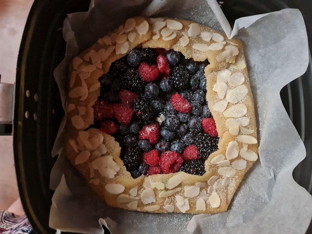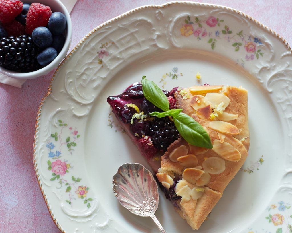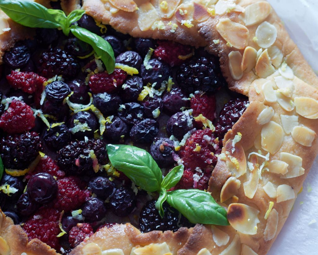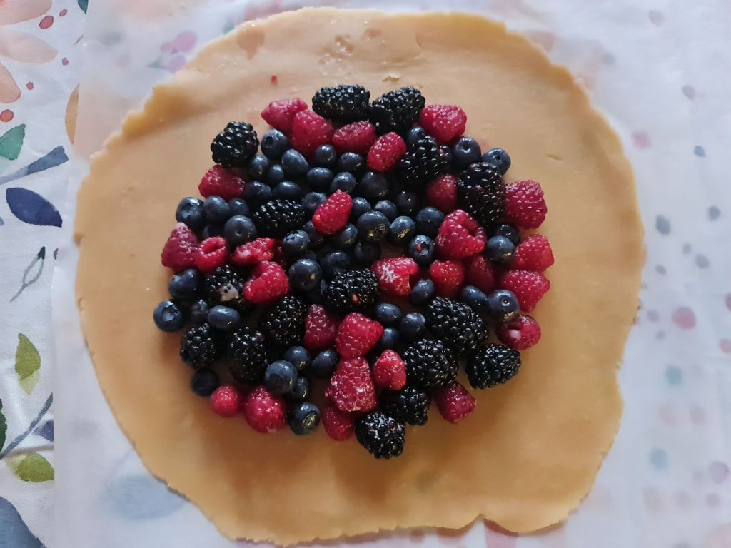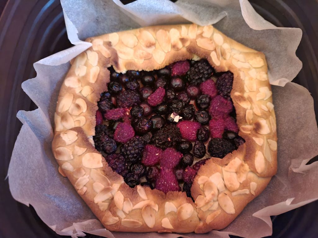 Този го направих с горски плодове – смес от малини, къпини и боровинки. Целият процес отне по-малко от час. Тестото за основата е маслено, с бадемово брашно и едно яйце. Вкусът се допълва от лимонова кора и пресен босилек, които добавят свежест и много подхождат на горските плодове.