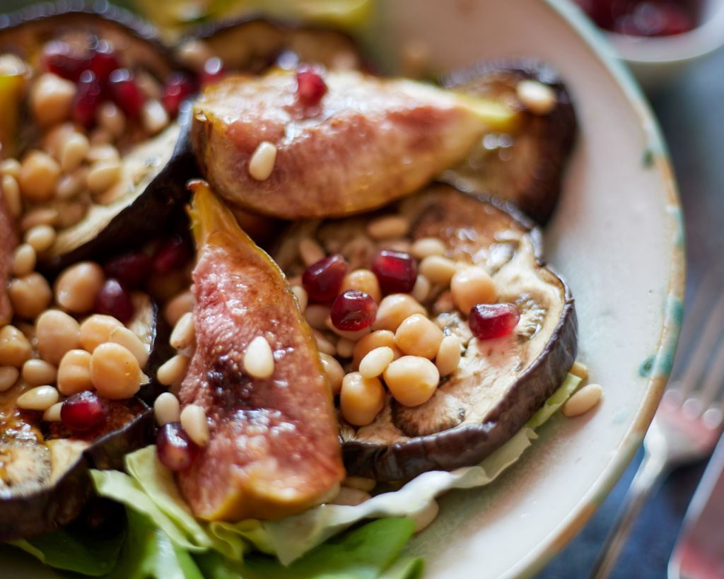 Напръскайте патладжаните с малко зехтин и ги сгответе в Air Fryer на 190 градуса за 17 – 20 минути. На 10та – 12та минута разбъркайте внимателно, преместете в едната половина на кошницата и добавете смокините. В чинии за сервиране разпределете едро накъсаната салата и добавете нахута, поохладените или напълно изстинали патладжани и смокини.