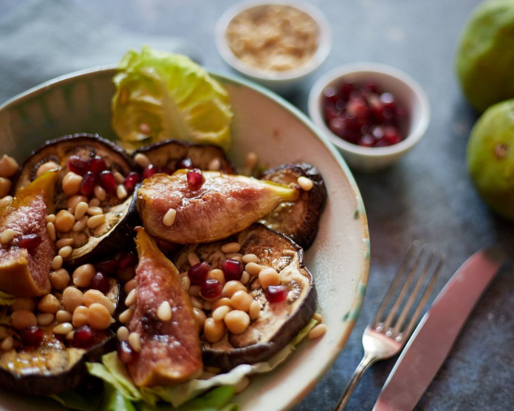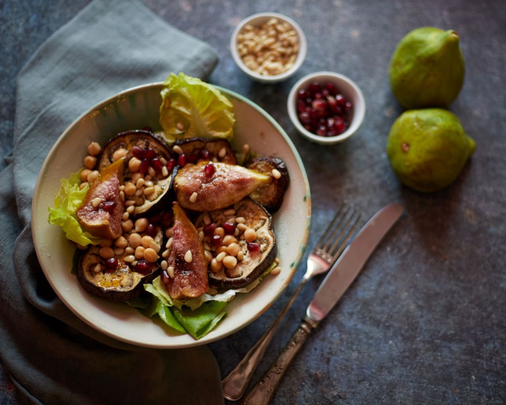 Това е една бърза салата, за която приготвих падладжаните в Air Fryer. Може да се изпекат предварително, защото не е задължително да са топли. Другият сезонен герой са смокините, които също запекох леко. Може да пропуснете тази стъпка и да ги оставите сурови, но след запичане имат прекрасен аромат и вкусът им е по-наситен, поне за мен.