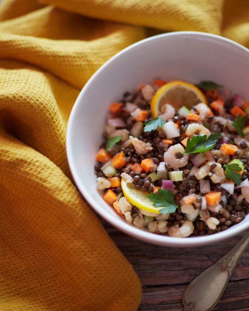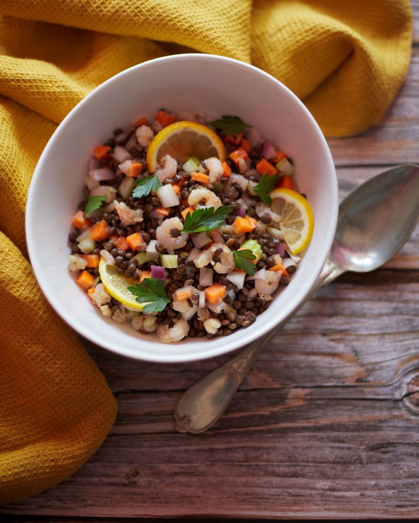 В тази конкретно я съчетах със скариди, моркови, селъри, лук и пикантна подправка кейджун. Имах един пакет дребни диво уловени скариди от Северно море и ги оставих цели. Ако вашите са по-големи, нарежете ги на кубчета. Така текстурата на салата ще бъде идеална. Морковите и селъри са сурови и придават прекрасна хрупкавост на ястието. Лимоновият сок в дресинга го прави свежо, а подправката кейджун добавя нотка пикантност.