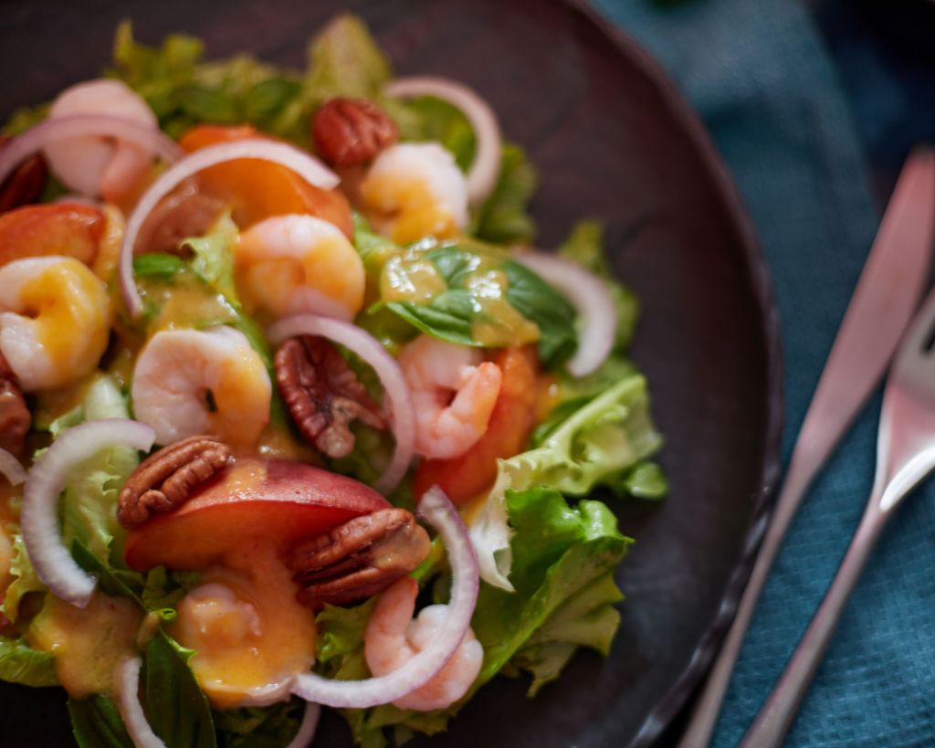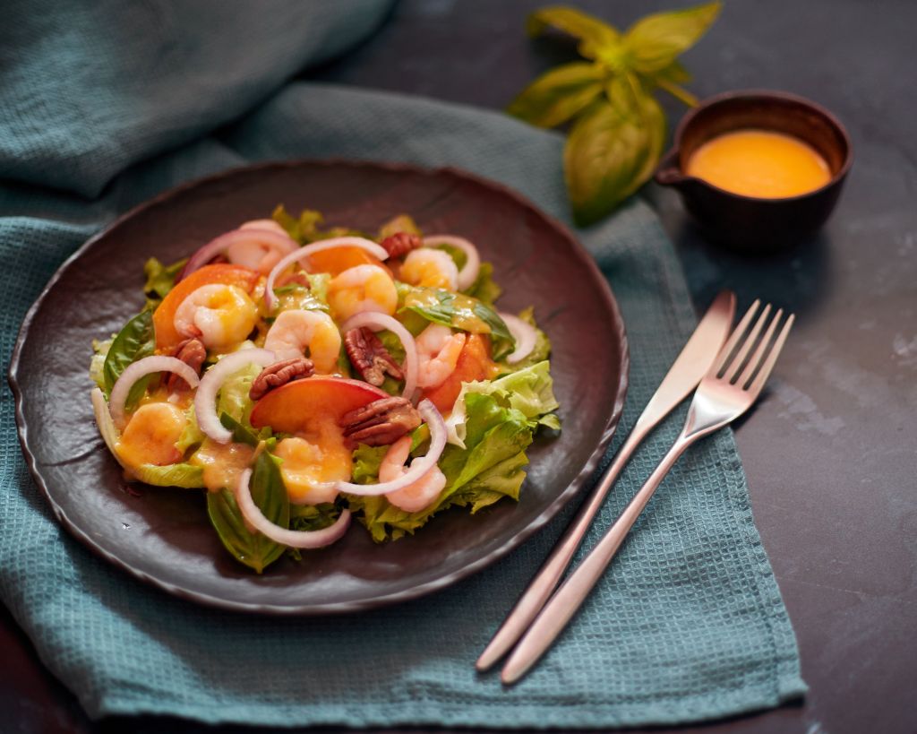 Накъсайте салатата и овкусете със зехтин и сол. Разпределете между две чинии и добавете лука, скаридите и прасковите. Гарнирайте с пекан и босилек и полейте с прасковен сос.