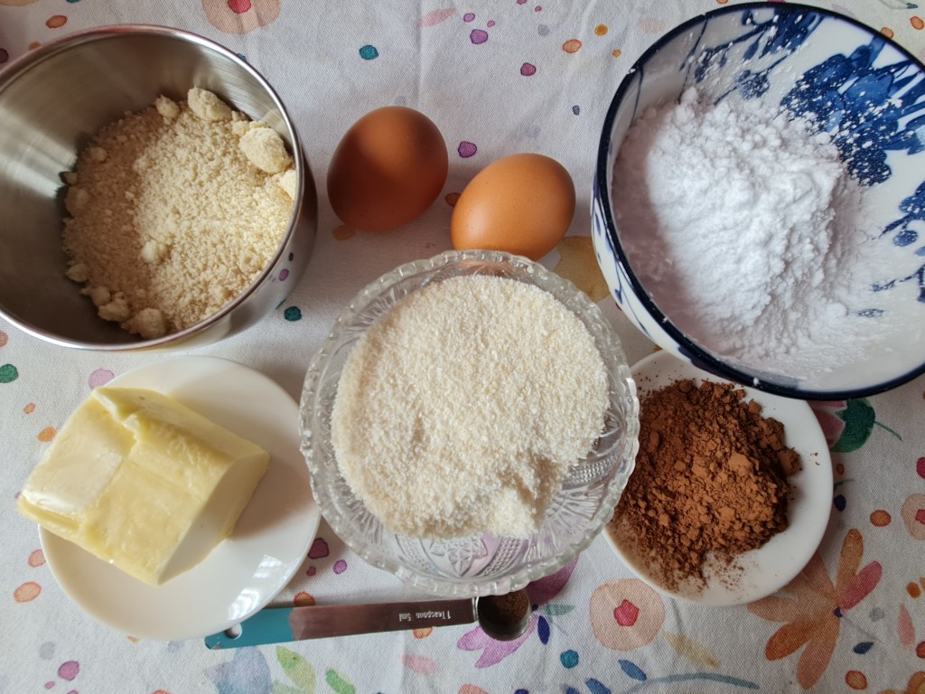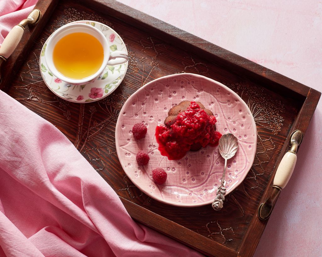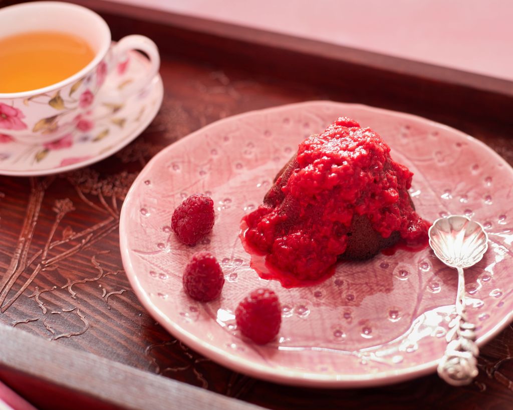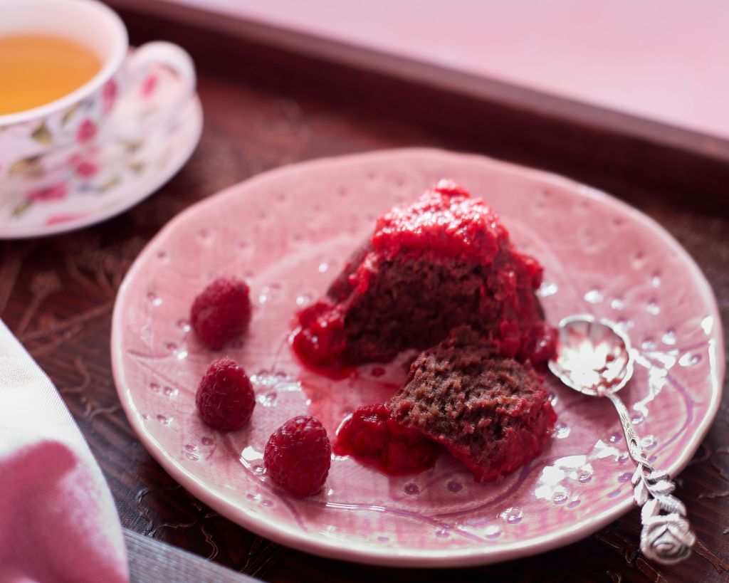 Поразгледах книгите и попаднах на една рецепта в „Сладко“ на Отоленги – кокосов кекс с шоколадова глазура. И от нея излезе този десерт, който има какао в тестото и вместо глазура има малинов сос.