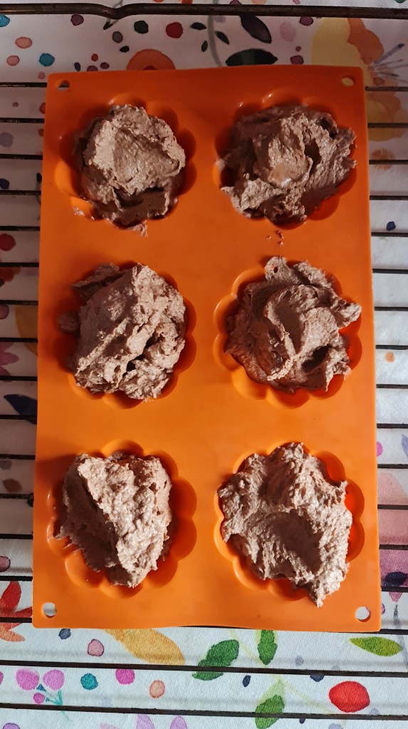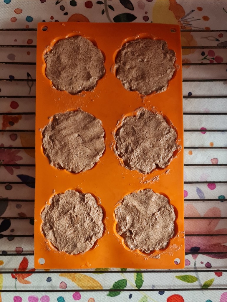 Добавете яйцата едно по едно. След като получите гладка смес, добавете бадемовото брашно и разбийте отново, докато се абсорбира напълно. Прехвърлете тестото във формите и заравнете с мокри пръсти. Печете 25 минути и изчакайте да изстинат.