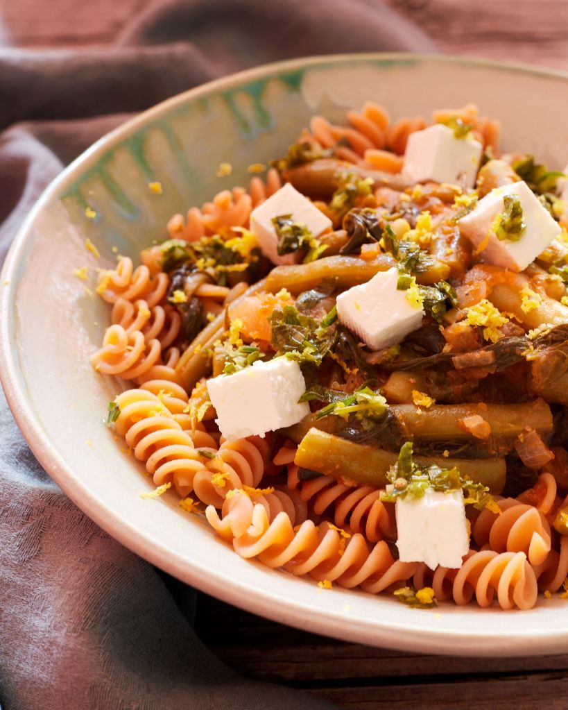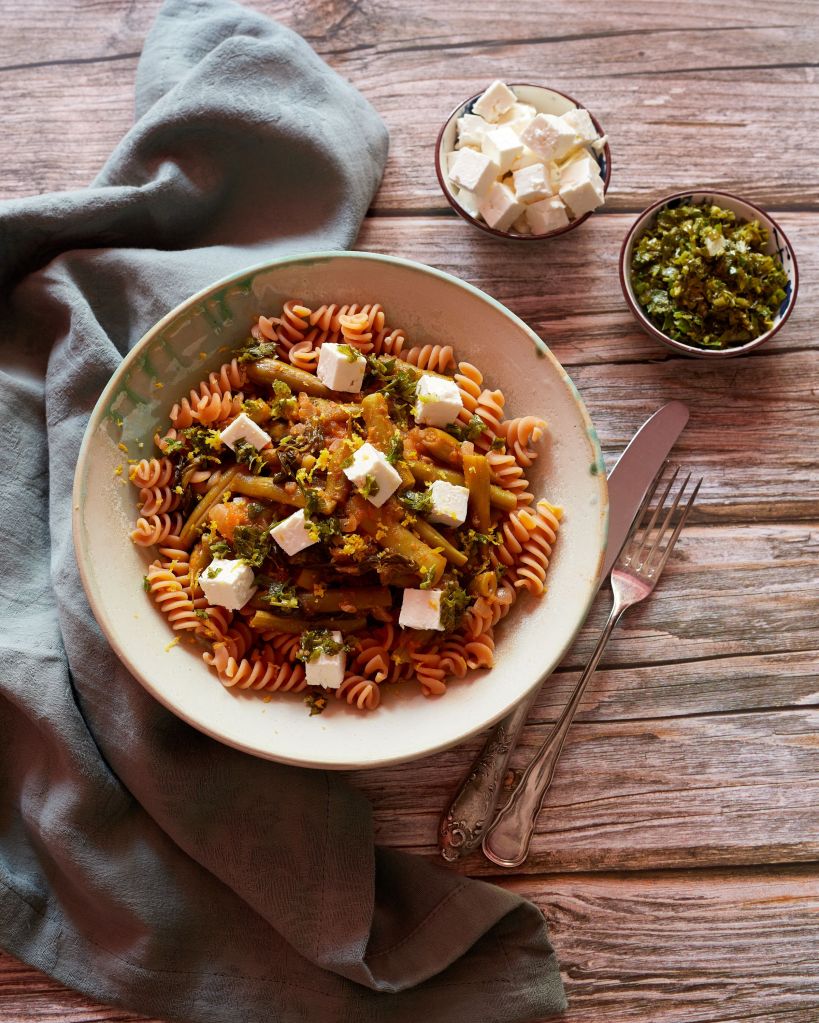 Това ястие без пастата е много хубава гарнитура към пиле, месо или риба. С пастата е самостоятелен обяд или вечеря, които се приготвят бързо и лесно.
