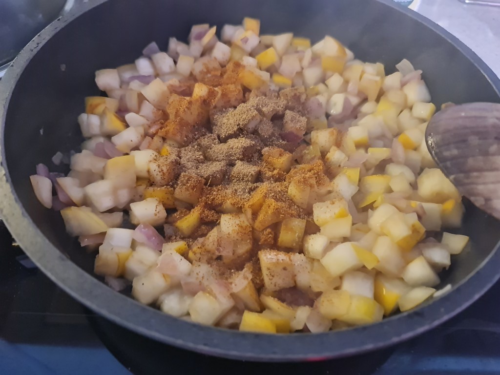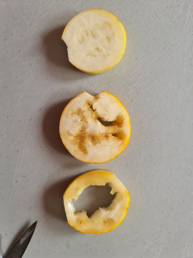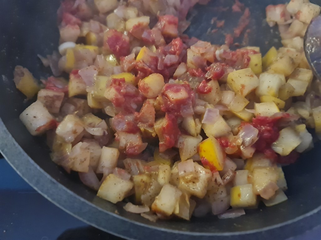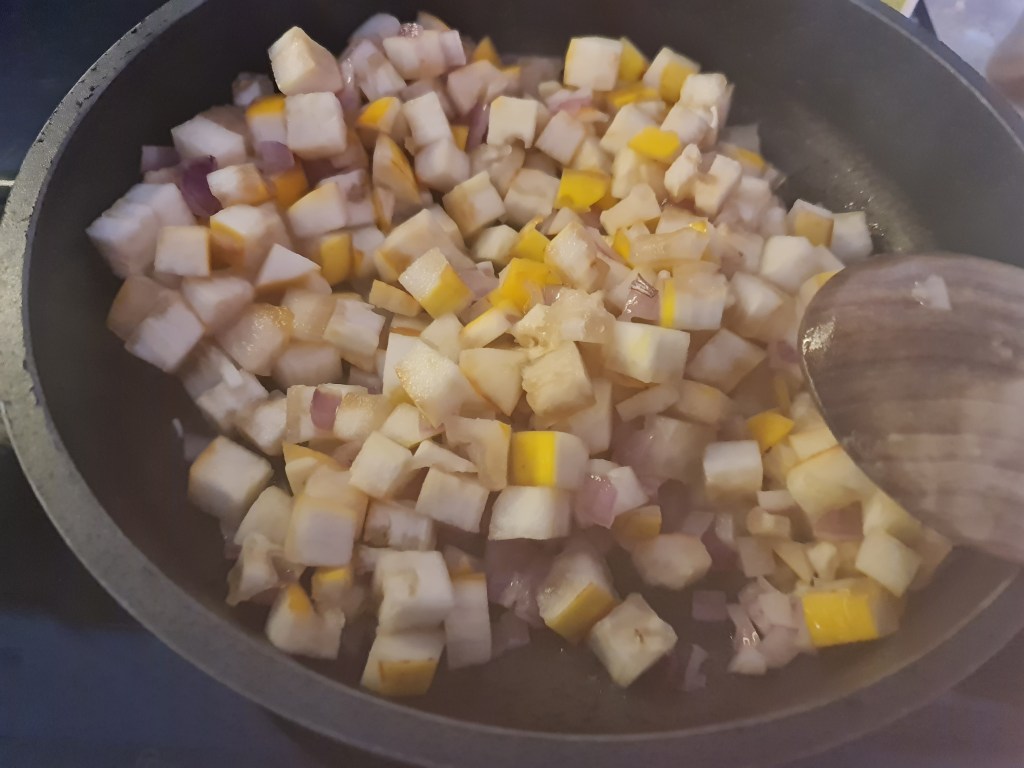 Едно от важните неща е, че семките на тези патладжани са горчиви и е добре да се отстранят. Аз винаги отцеждам този зеленчук, за да избегна остатъчна горчивина. В този случай, освен това го накиснах във вода, според инструкциите, за около 45 минути. След прецеждане, водата беше с цвят на бира. Месото е по-твърдо и иска малко по-дълго готвене – около 5 минути повече. Вкусово е малко по-различен, без отличителния землист вкус на лилавите патладжани.