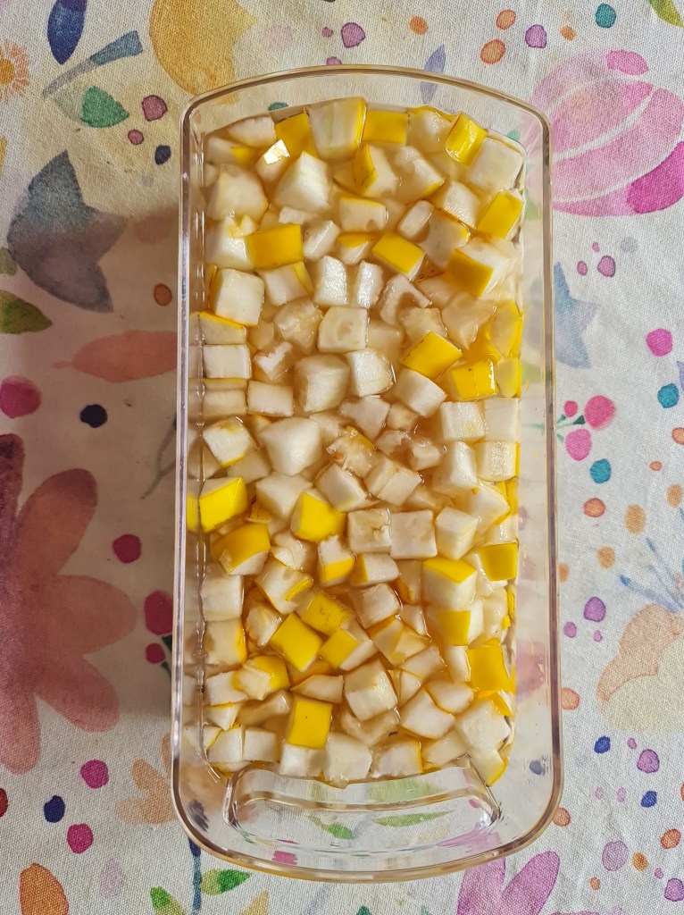 Измийте и нарежете патладжаните на шайби. Ако сте взели жълти патладжани, отстранете семките. Те са в едната половина, не в целия зеленчук, както при лилавия. От някои парчета ще ви остане само периферия. Посолете и наредете върху домакинска хартия за 30 минути. След това нарежете на кубчета (аз ползвам резачка на Гефу) и накиснете във вода за поне 30 минути.