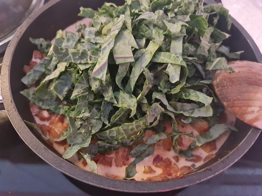 150 г кейл, почистен от стъблата и жилите и нарязан на тънки ленти (може да замените с 200 г спанак)