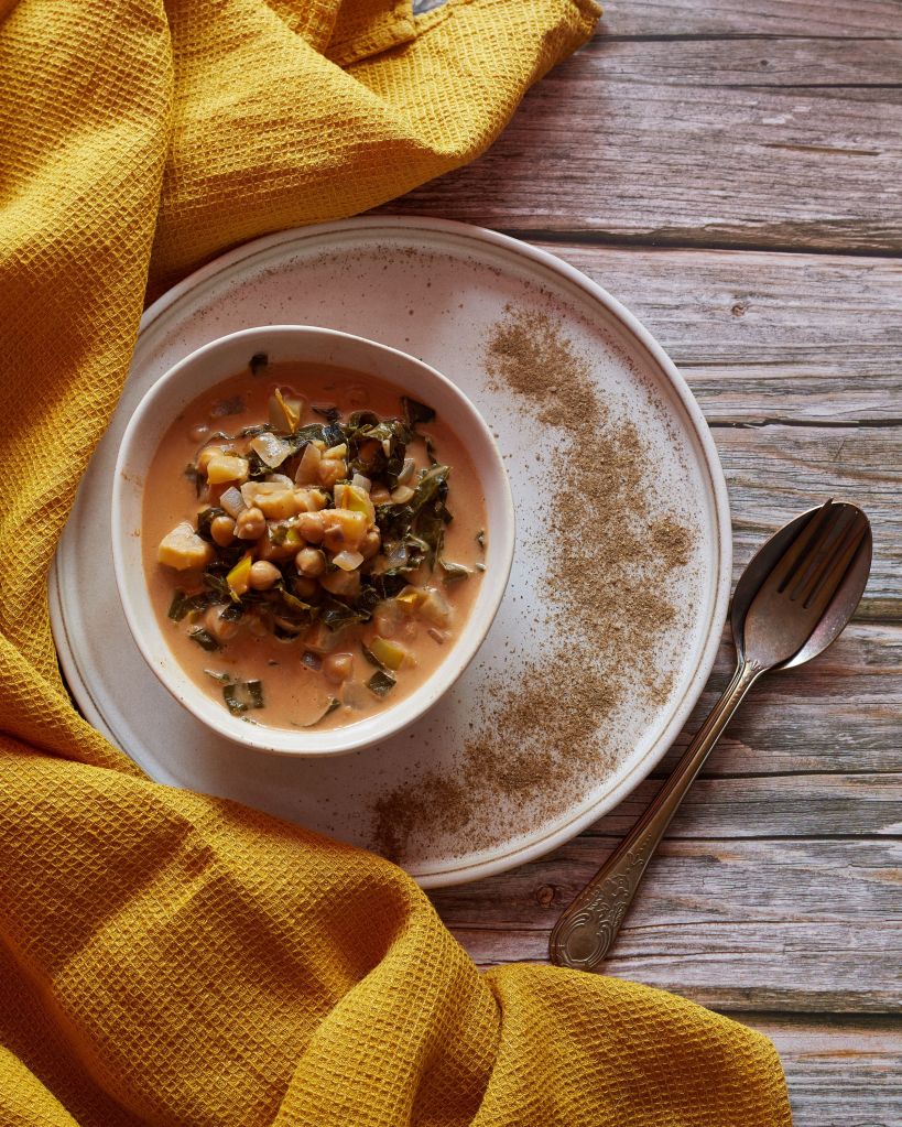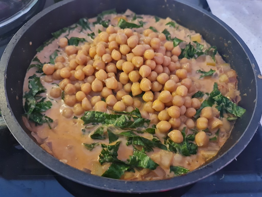 Загрейте зехтина в дълбок тиган на средна степен и задушете лука и чесъна до златисто. Добавете патладжана, посолете и разбъркайте. Добавете подправките и разбъркайте. Добавете доматената паста и разбъркахте отново. Гответе около 5 минути. Добавете кокосовото мляко, увеличете леко котлона, за да заври, след което намалете и добавете кейла. Похлупете и гответе още 5 минути. Добавете отцедения нахут и гответе още 5 минути.