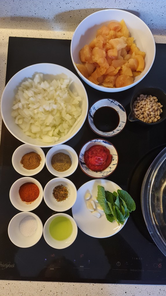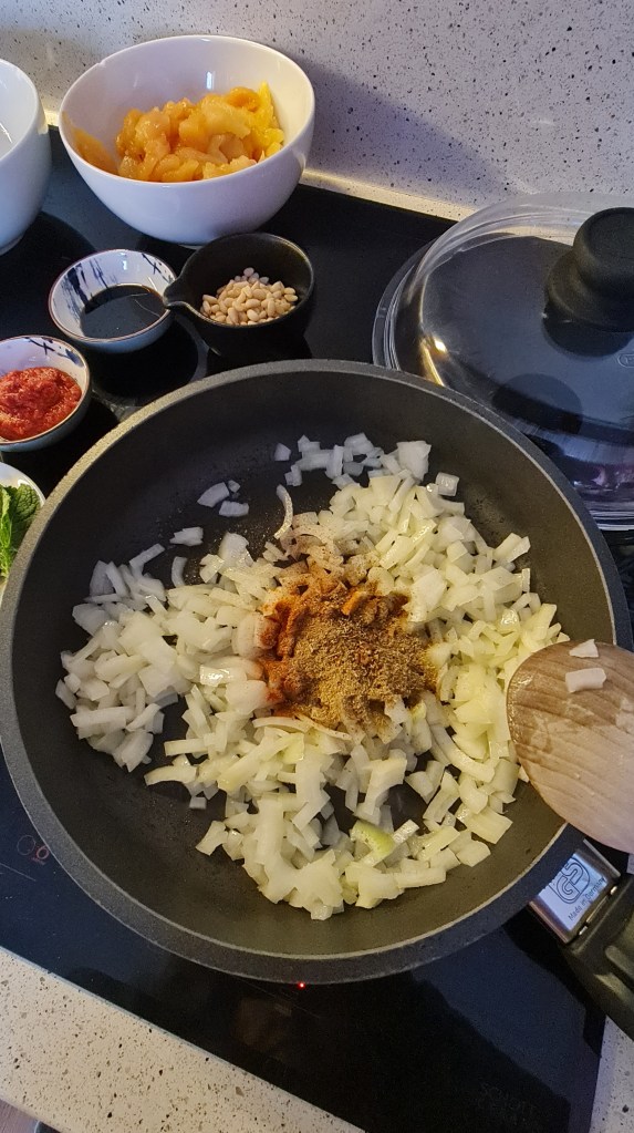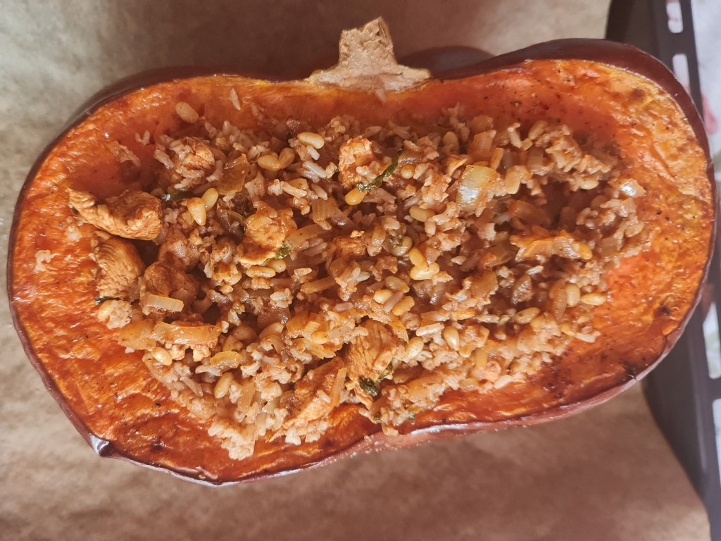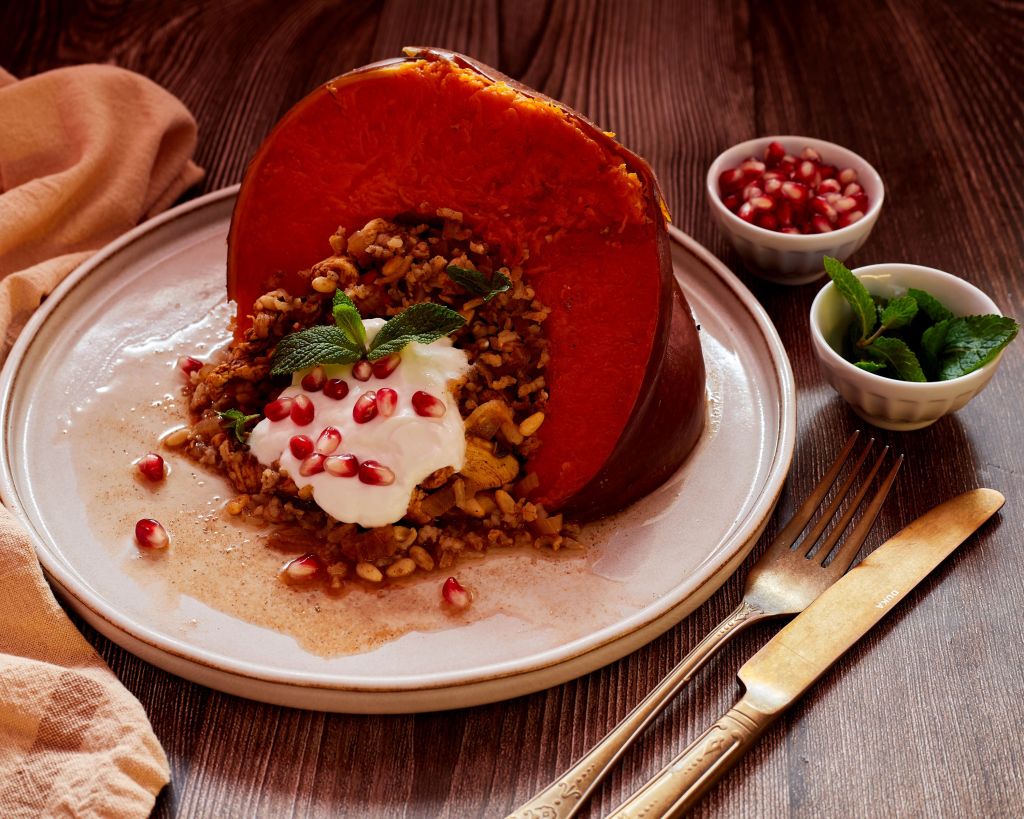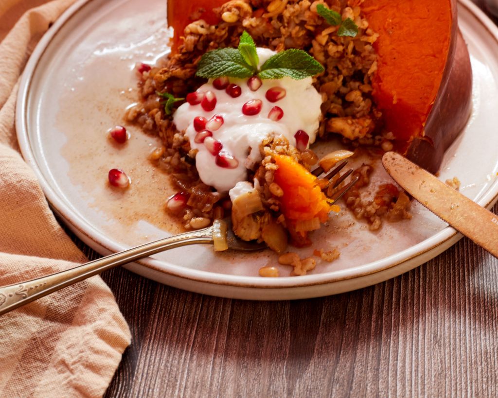 Ето къде отиде по-голямата част от първата ми тиква тази есен. Оригиналната рецепта е с агнешко, но то не е в сезон, затова замених с пиле. Освен месото, в пълнежа има лук, чесън, кедрови ядки, меласа от нар и ориз. Типичните за Мароко кимион, канела, хариса и прясна мента правят това ястие неустоимо вкусно. Гарнирах го с гъсто кисело мляко, нар и още прясна мента.