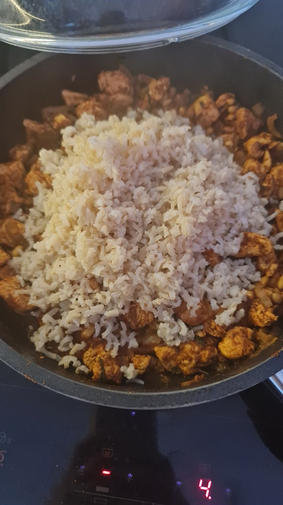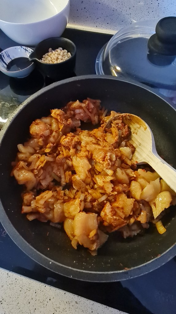 През това време загрейте половината от зехтина на средна степен на котлона и задушете лука за 3 – 4 минути. Добавете подправките и разбъркайте много добре. Гответе още 3 – 4 минути и добавете пресования чесън. Разбъркайте и добавете доматеното пюре и пилето. Гответе 5 – 7 като разбърквате.