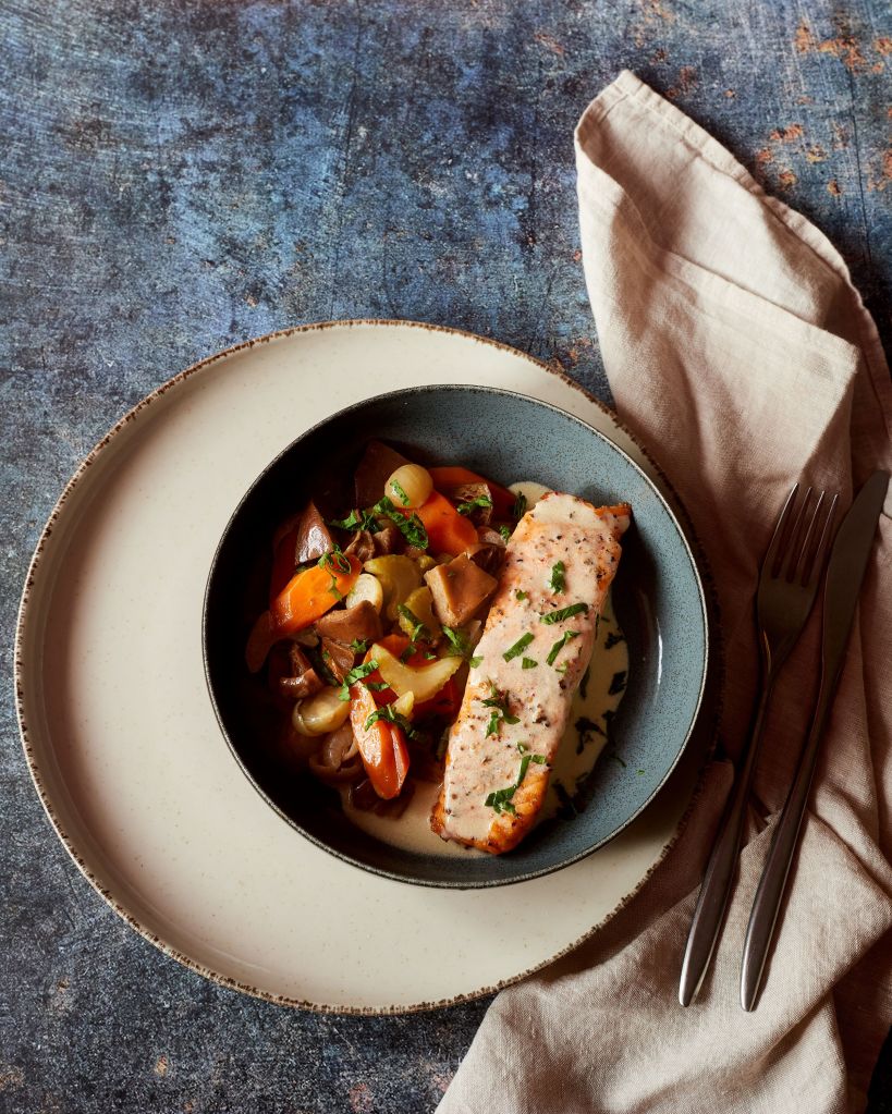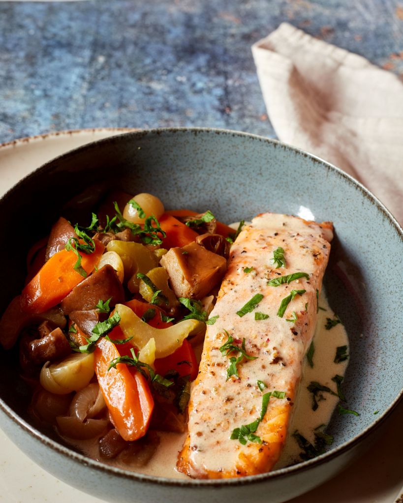 Загрейте 1 с.л. масло в тиган с дебело дъно на средна степен на котлона и добавете арпаджика. Задушете за 2 – 3 минути и добавете морковите (след бланширане). Гответе още 2 – 3 минути и добавете селъри. Разбъркайте, посолете и добавете останалото масло. След като се разтопи, добавете гъбите и захлупете. Гответе около 5 минути и открийте, разбъркайте и добавете сметаната. Оставете на котлона още около 2 минути преди да изключите. Похлупете и дръжте топло до сервиране.