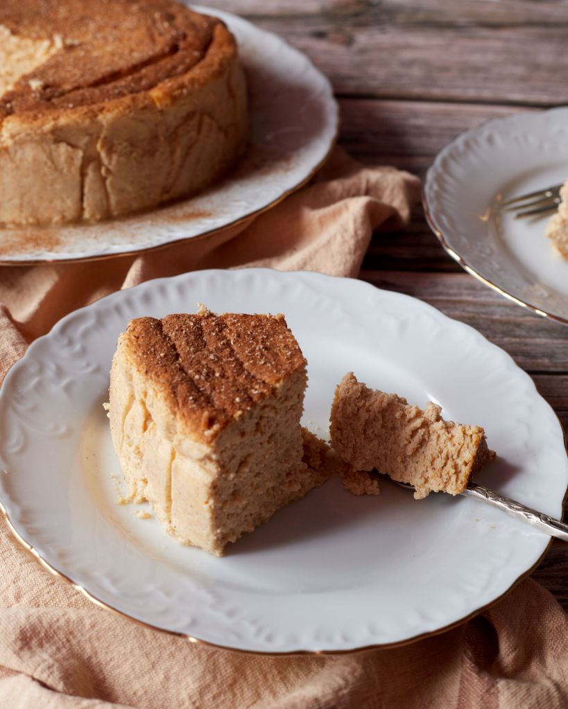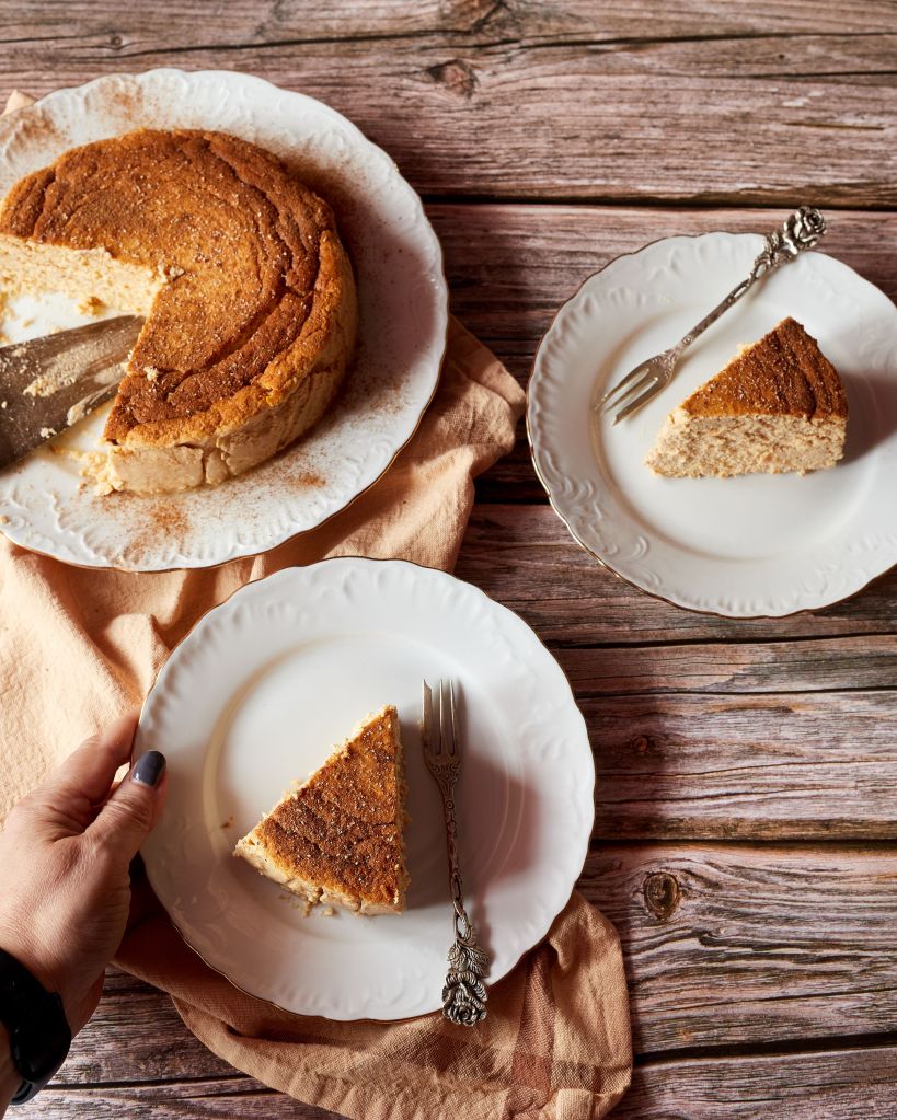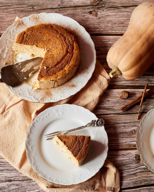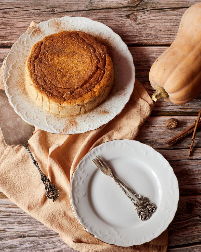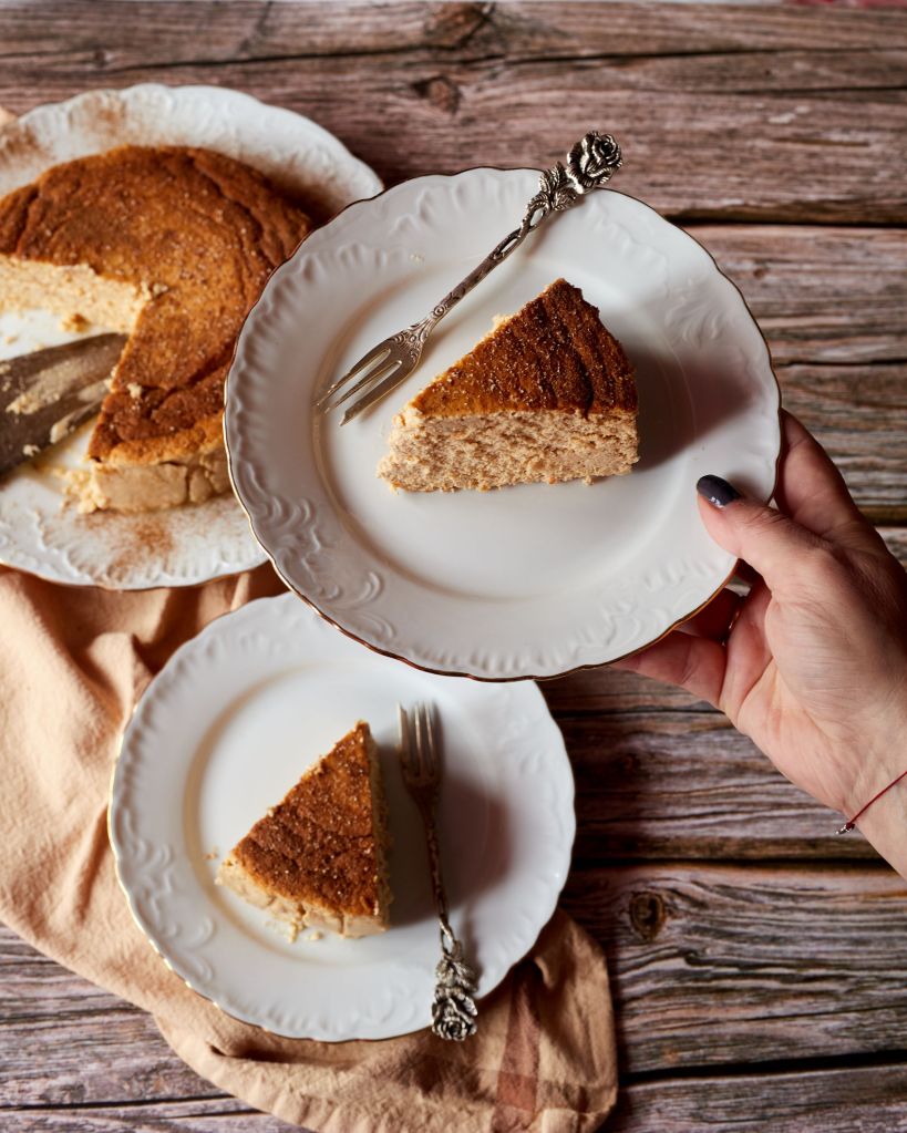 Това е чийзкейк без основа и с тиквено пюре в сместа. Получава се малко по-водниста, заради пюрето, затова добавих кокосово брашно, което обира излишната влага. Тиквеното пюре подправих с моята версия на популярната подправка – смес от канела, индийско орехче и джинджифил. Подсладих с еритритол и се получи чудесен нисковъглехидратен десерт.