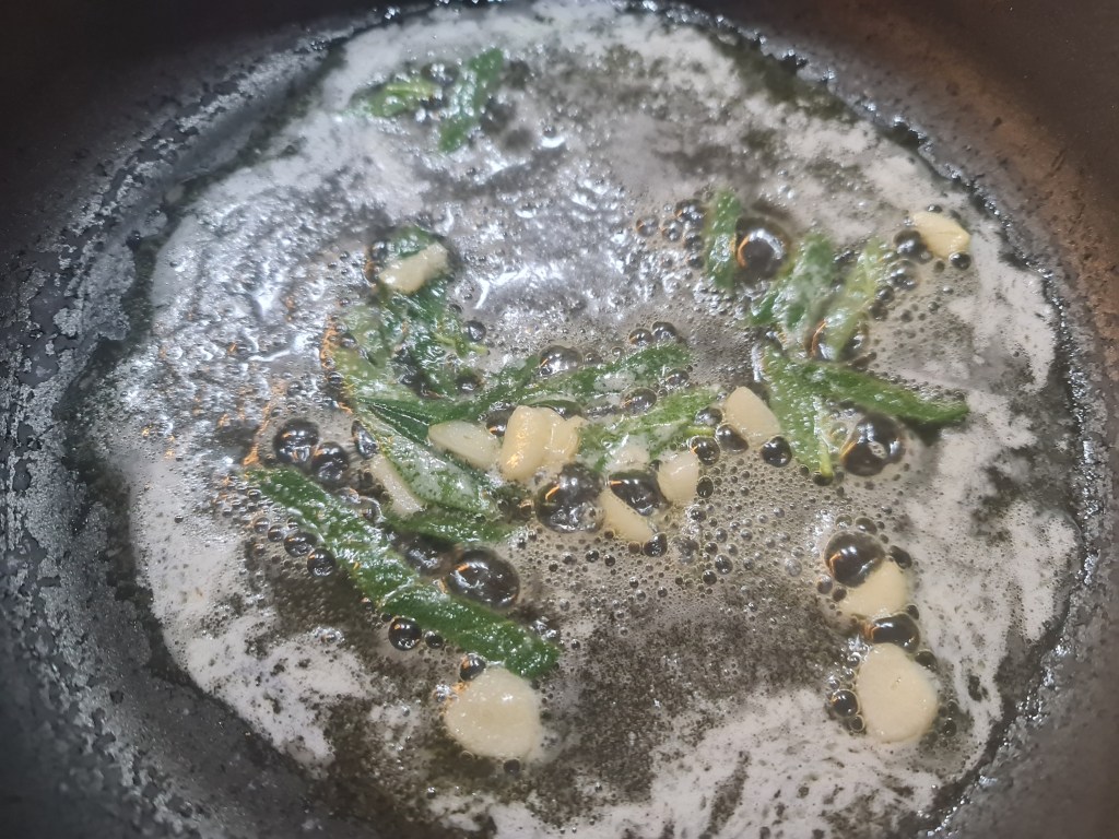 В друг съд загрейте маслото на средна степен и добавете нарязания на филийки чесън. Гответе минута две. Добавете нарязаните листа салвия и гответе около минута. Добавете натрошеното сирене и сметаната, разбъркайте и изчакайте минута две, за да се оформи соса. Последно добавете запазената вода от варенето (ако не сте ги варили, добавете обикновена вода) и разбъркайте.
