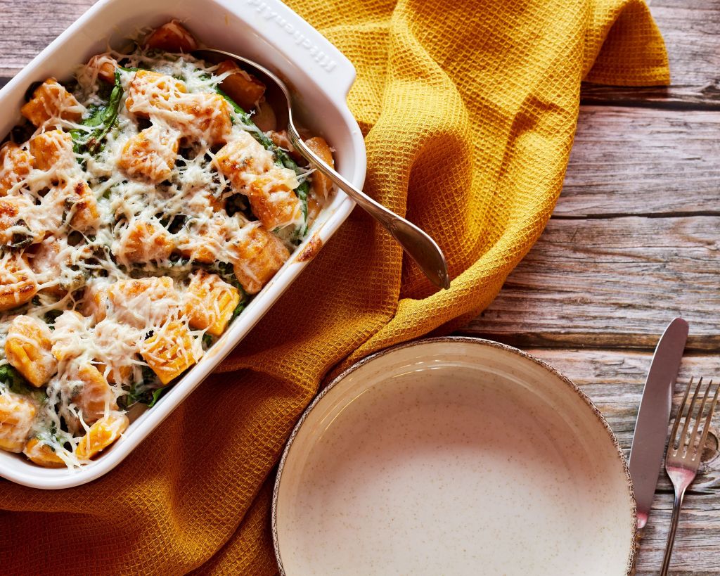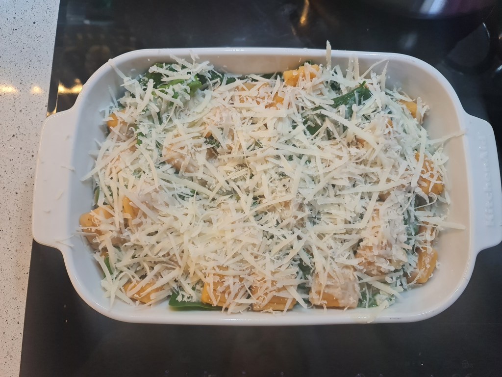 Включете фурната на функция грил (само горен реотан) на средна степен. В тавичка с размери 15 х 25 см сложете половината спанак и върху него половината ньоки. Повторете. Полейте ньоките със соса и поръсете с пекорино.