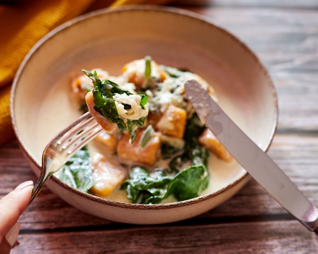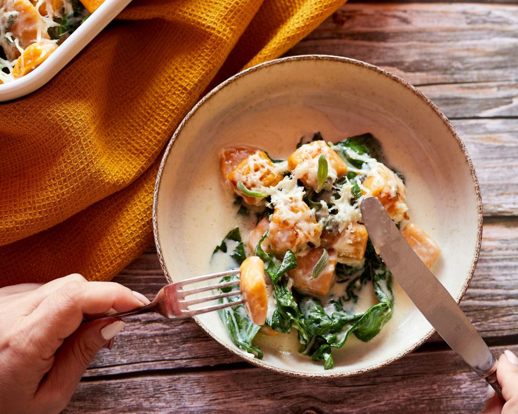 Оригиналът е веган, но спокойно можете да замените кокосовото мляко със сметана. Горещо препоръчвам да опитате, понеже комбинацията от тиква, сметана и синьо сирене е просто прекрасна. Но, ако предпочитате готови, този пост е основно за соса, който би подхождал и на класически картофени ньоки.