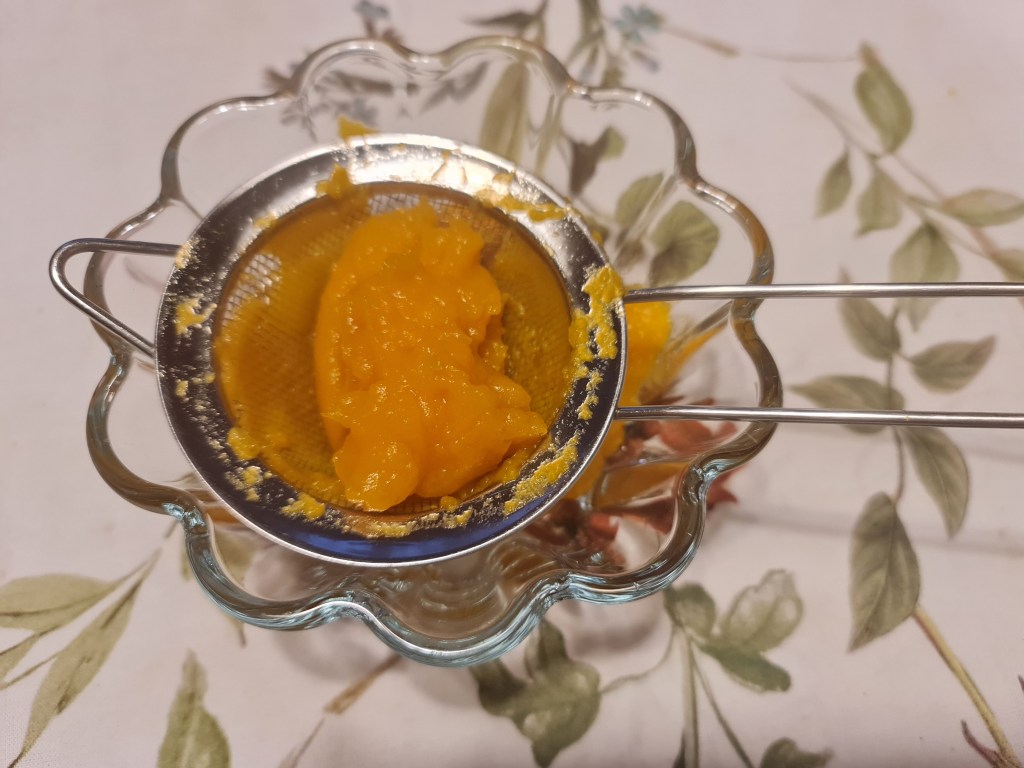 За да приготвите пюрето, първо изпечете тиквата. Отделете нужния грамаж и пюрирайте в блендер до гладка смес. Ако тиквата има естествена сладост (аз ползвам мускатна/матилда), не подслаждайте. Добавете индийското орехче, разбъркайте добре и минете сместа през цедка – така ще отделите евентуално останали влакна. Оставете на страна.