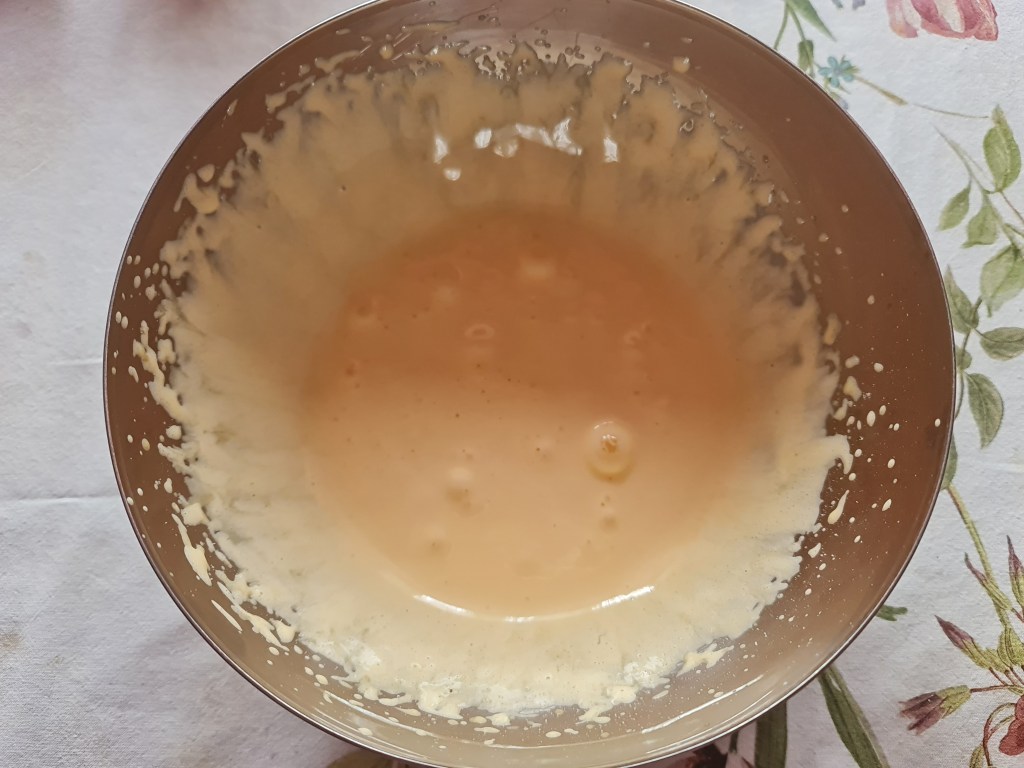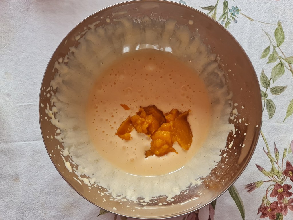 В друг съд разбийте много добре жълтъците и еритритола (до получаване на пухкава бледожълта смес – може на ръка или с миксер). Добавете пюрето и разбийте до хомогенизиране.