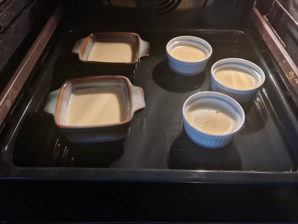 Разделете сместа между съдовете за крем брюле и налейте вода в тавата до около половината височина на съдовете. Добре е водата да е топличка, но не вряща.